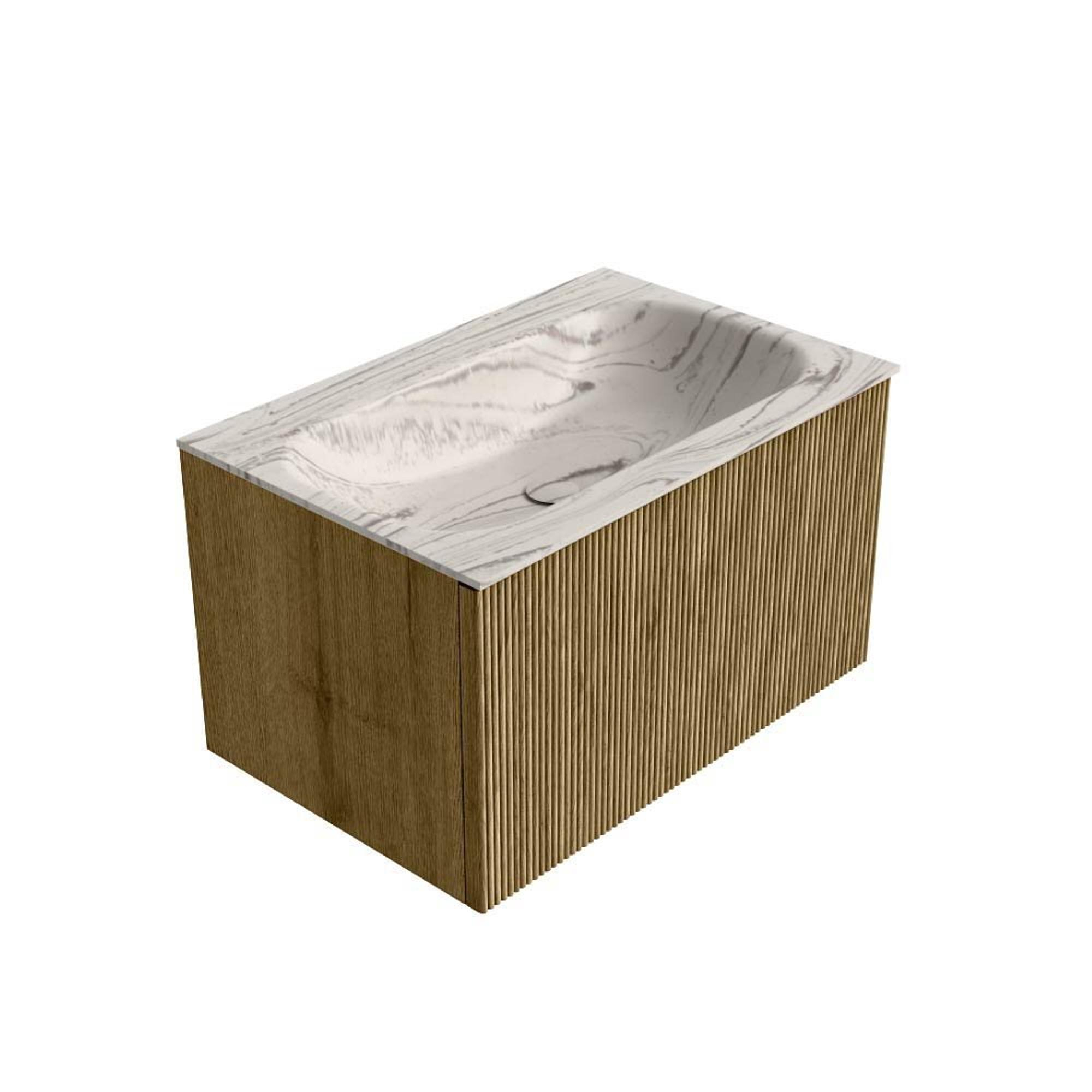 La forme frontale semi-circulaire combinée aux rainures verticales confère à ce meuble un véritable caractère design. La couleur Dusk, inspirée des tons de bois chauds, crée une base apaisante et naturelle qui se marie bien aussi bien avec des carreaux clairs qu’avec des accents foncés. La structure verticale a en outre un effet de rajeunissement sur l’espace : le regard est littéralement guidé vers le haut, ce qui donne l’illusion d’une salle de bains plus haute et plus spacieuse. C’est donc un choix astucieux si vous souhaitez créer, avec un meuble relativement compact, un élément accrocheur et luxueux. En jouant avec des accessoires par exemple en noir, en chrome ou en or brossé, vous pouvez facilement imposer votre propre style, tandis que le meuble lui-même reste intemporel.