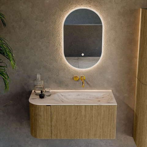La combinaison de la couleur chaude Dusk avec l’angle gauche arrondi donne immédiatement à votre salle de bains une apparence douce et luxueuse. Les façades nervurées avec structure verticale apportent une profondeur et un caractère supplémentaires, ce qui fait de ce meuble un véritable point de mire contre un mur carrelé sobre. Grâce à la finition sans poignées et à la fonction push-to-open, la façade reste épurée et calme, idéale si vous recherchez une atmosphère minimaliste et ordonnée. La teinte bois se marie parfaitement avec des sols clairs comme foncés et s’associe bien avec des robinets et accessoires noirs, chromés ou en métal brossé. Vous composez ainsi facilement un ensemble de meubles élégant qui s’harmonise avec le reste de vos sanitaires.
