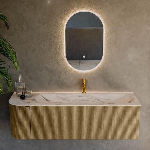 La combinaison de la couleur Dusk avec le jeu de lignes arrondies sur le côté gauche confère à votre meuble de salle de bains un accent design subtil sans qu’il ne devienne dominant. Les façades nervurées avec texture verticale créent de la profondeur et du luxe, comparables aux meubles sur mesure dans les intérieurs haut de gamme. Grâce à la forme de base rectangulaire avec coins arrondis, le meuble a une apparence épurée et moderne, mais reste néanmoins chaleureux et accessible. La composition asymétrique, avec le lavabo à droite et plus d’espace de plan à gauche, rend le meuble idéal pour ceux qui aiment garder un peu d’espace autour du robinet pour les objets du quotidien. Ce meuble s’exprime particulièrement bien dans les salles de bains de taille moyenne à grande, mais peut également devenir l’élément phare d’un espace compact grâce au montage flottant. Combinez-le avec un miroir ou une armoire de toilette minimaliste et vous créez en une fois une base calme et harmonieuse.