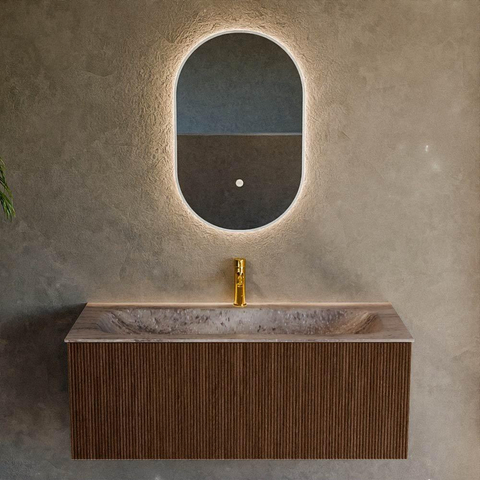 La teinte chaleureuse walnut combinée à la façade nervurée verticale donne immédiatement du caractère à votre salle de bains. La structure de bois subtile semble naturelle et conviviale, tandis que les lignes épurées et la forme rectangulaire sont au contraire très modernes. Grâce aux façades rainurées, le meuble affiche une allure luxueuse que l’on retrouve plutôt dans les hôtels design. De plus, la teinte bois se marie facilement avec des carreaux clairs comme avec des accents foncés, des robinets noirs ou au contraire en chrome. Vous pouvez ainsi développer facilement le style de votre salle de bains sans être coincé dans une seule tendance. La gamme de couleurs bois est intemporelle et reste également à long terme un choix sûr et de bon goût.