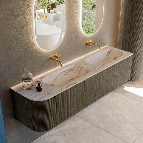Le double lavabo à droite vous offre précisément l’espace là où vous en avez le plus besoin : autour des robinets et des vasques. Idéal si vous souhaitez vous brosser les dents ou effectuer votre routine matinale à deux, sans vous gêner. Le lavabo Stor Small est conçu en version double, de sorte que vous disposiez clairement de deux “espaces” distincts, tout en conservant un ensemble visuellement épuré. Comme il n’y a pas de trous de robinet dans le plan, vous avez toute liberté de choisir des mitigeurs surélevés élégants sortant du mur ou posés sur le plan, parfaitement adaptés à votre style. L’arrondi sur le côté gauche adoucit les lignes, facilite le passage dans la salle de bains et confère au meuble une apparence plus douce et axée sur le design.