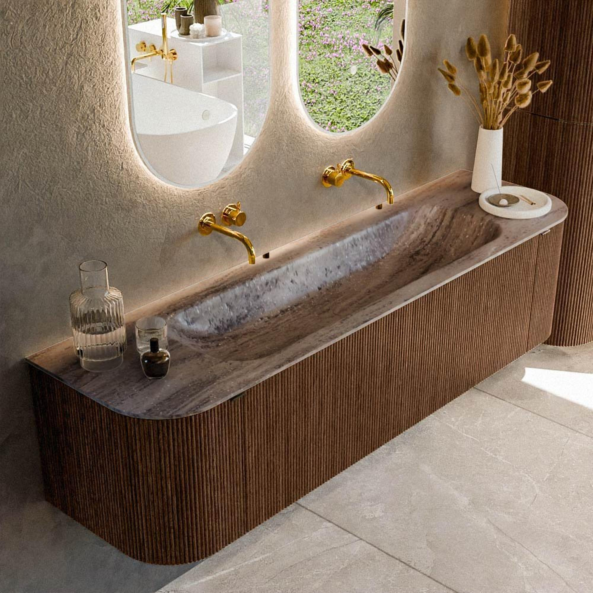 Les angles arrondis à gauche et à droite confèrent au meuble une allure élégante, presque organique, qui attire immédiatement le regard. Combinés à la teinte chaude noyer et à la structure à nervures verticales sur les façades, ils créent un meuble qui apporte profondeur et caractère à votre salle de bains. La vasque fine et continue en solid surface a un aspect minimaliste et épuré, ce qui garde l’ensemble calme et haut de gamme. Grâce à la teinte bois neutre, ce meuble se marie aisément avec des robinets noirs, chromés ou en métal brossé, mais aussi avec des carreaux clairs ou foncés. Vous pouvez ainsi créer facilement différents styles de salle de bains, du moderne et luxueux au chaleureux et naturel, sans faire de concessions sur l’esthétique.