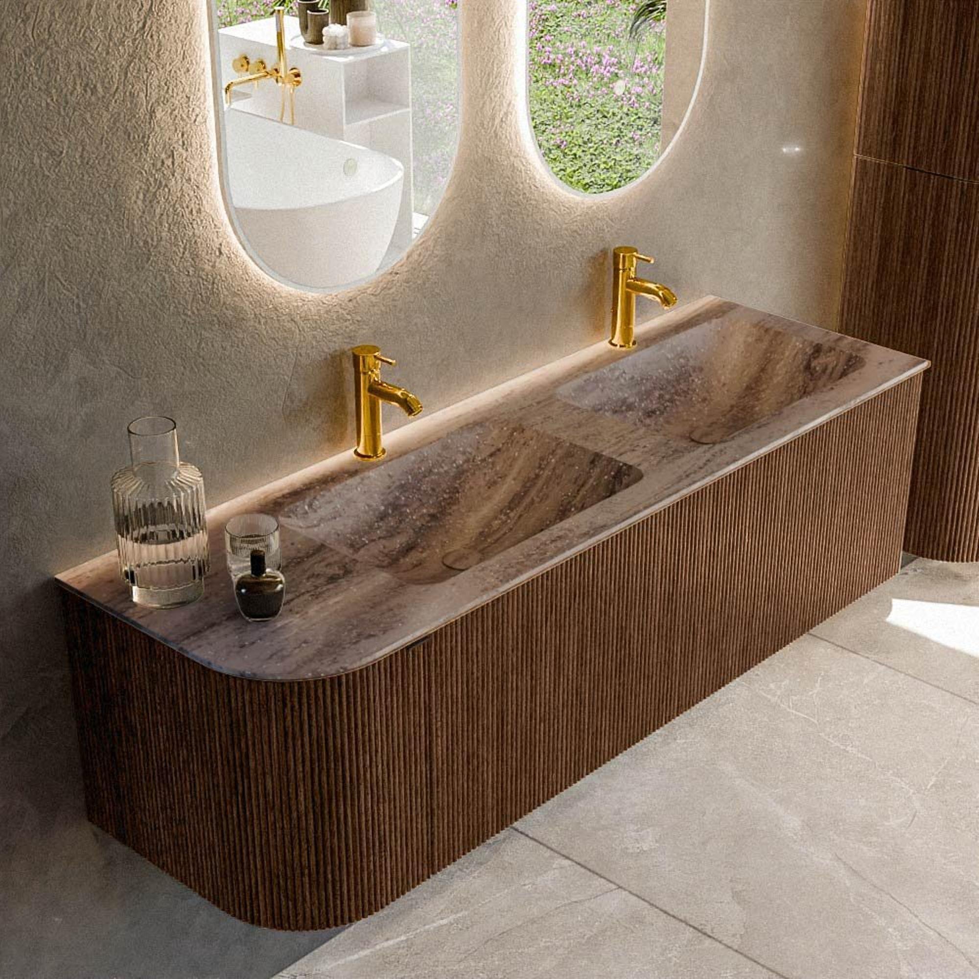 MONDIAZ KURVE-DLUX 145cm meuble de salle de bains arrondi gauche couleur Walnut avec 1 tiroir et 1 porte. Lavabo LEAF Double / droit 2 trous de robinet Oza.
