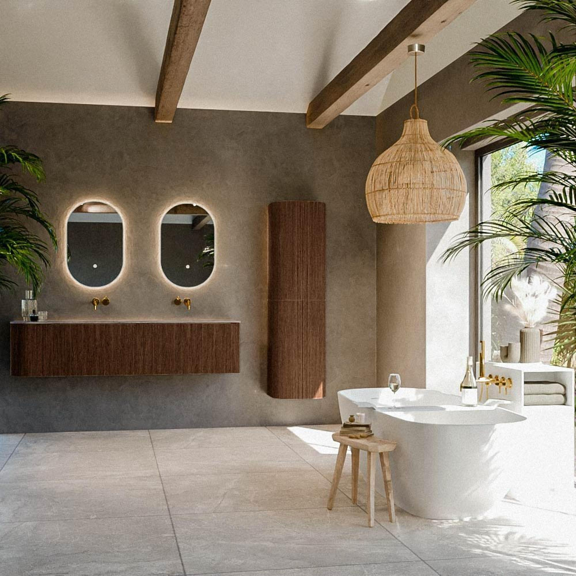 La couleur noyer et la structure nervurée des façades confèrent à ce meuble une apparence luxueuse, proche du mobilier, qui s’intègre parfaitement dans les salles de bains modernes, d’inspiration hôtel chic ou scandinave. Le plan épuré en solid surface de couleur Oza crée un magnifique contraste avec le bois et paraît particulièrement raffiné. Comme le lavabo est réalisé en version double à droite, l’ensemble s’accorde parfaitement avec les salles de bains dans lesquelles le robinet sort du mur ou dans lesquelles vous choisissez délibérément une apparence minimaliste sans trous de robinetterie. Vous créez ainsi un ensemble sobre et élégant qui restera, même après des années, intemporel et qualitatif.