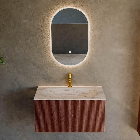 La teinte Ruby profonde du sous-meuble fait de ce meuble un véritable statement design. Le rouge a une apparence chaude et luxueuse et se marie à merveille avec des carreaux neutres, des accents noirs ou au contraire des tons beiges et sable doux. La texture cannelée verticale sur la façade apporte une profondeur et un caractère supplémentaires, ce qui fait que le meuble attire immédiatement le regard sans être criard. Il s’intègre ainsi parfaitement dans les salles de bains design modernes, mais aussi dans un style hôtel-chic ou scandinave avec une touche originale. Le tiroir sans poignée avec système push-to-open renforce le caractère minimaliste : aucune poignée visible, mais une façade épurée qui s’intègre entièrement dans les lignes de votre salle de bains. Vous créez ainsi une base calme et haut de gamme dont vous profiterez pendant de nombreuses années.