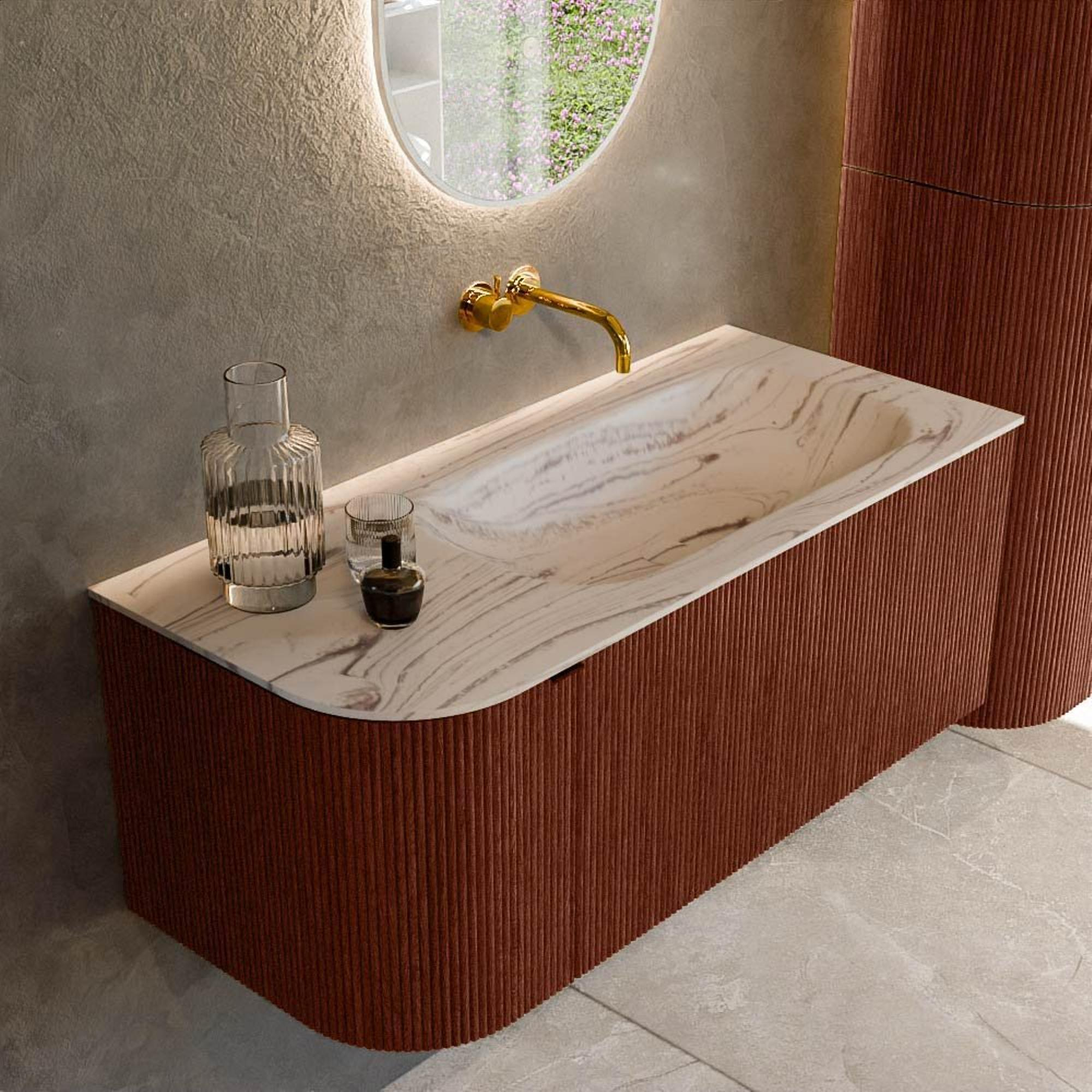 La forme arrondie sur le côté gauche crée immédiatement une apparence raffinée, presque organique. Pas d’angle vif à l’entrée, mais une courbe douce qui rend l’espace plus chaleureux et facilite le passage le long du meuble. La couleur Ruby est une teinte rouge profonde qui apporte chaleur et caractère à votre salle de bains, se mariant à merveille avec des carreaux neutres, une robinetterie noire ou au contraire des accents en laiton. Grâce à la façade rainurée avec des lignes verticales, le meuble gagne en profondeur et en texture, ce qui lui donne un aspect luxueux et en fait réellement le point central du mur de la salle de bains. La largeur de 105 cm offre une zone de lavage généreuse sans que le meuble ne paraisse massif ou lourd. Vous optez ainsi pour un meuble de salle de bains élégant qui fait immédiatement passer votre salle de bains au niveau supérieur.