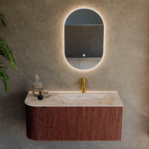 La courbe douce sur le côté gauche n’est pas seulement agréable à regarder, elle est surtout astucieuse à l’usage. Vous créez plus d’espace de circulation au niveau du passage, par exemple près de la porte de la salle de bains ou en face de la douche, sans sacrifier la largeur du plan. Cela rend le meuble particulièrement adapté aux salles de bains où chaque centimètre compte, tout en conservant une allure luxueuse et généreuse. La combinaison de la couleur Ruby avec le plan de lavabo clair Nata offre un aspect chaleureux et moderne, permettant au meuble de bien s’intégrer dans les salles de bains contemporaines, design ou de style hôtel chic. La forme aux angles arrondis paraît conviviale et sûre, ce qui est particulièrement appréciable s’il y a des enfants à la maison ou si vous souhaitez éviter les arêtes vives.