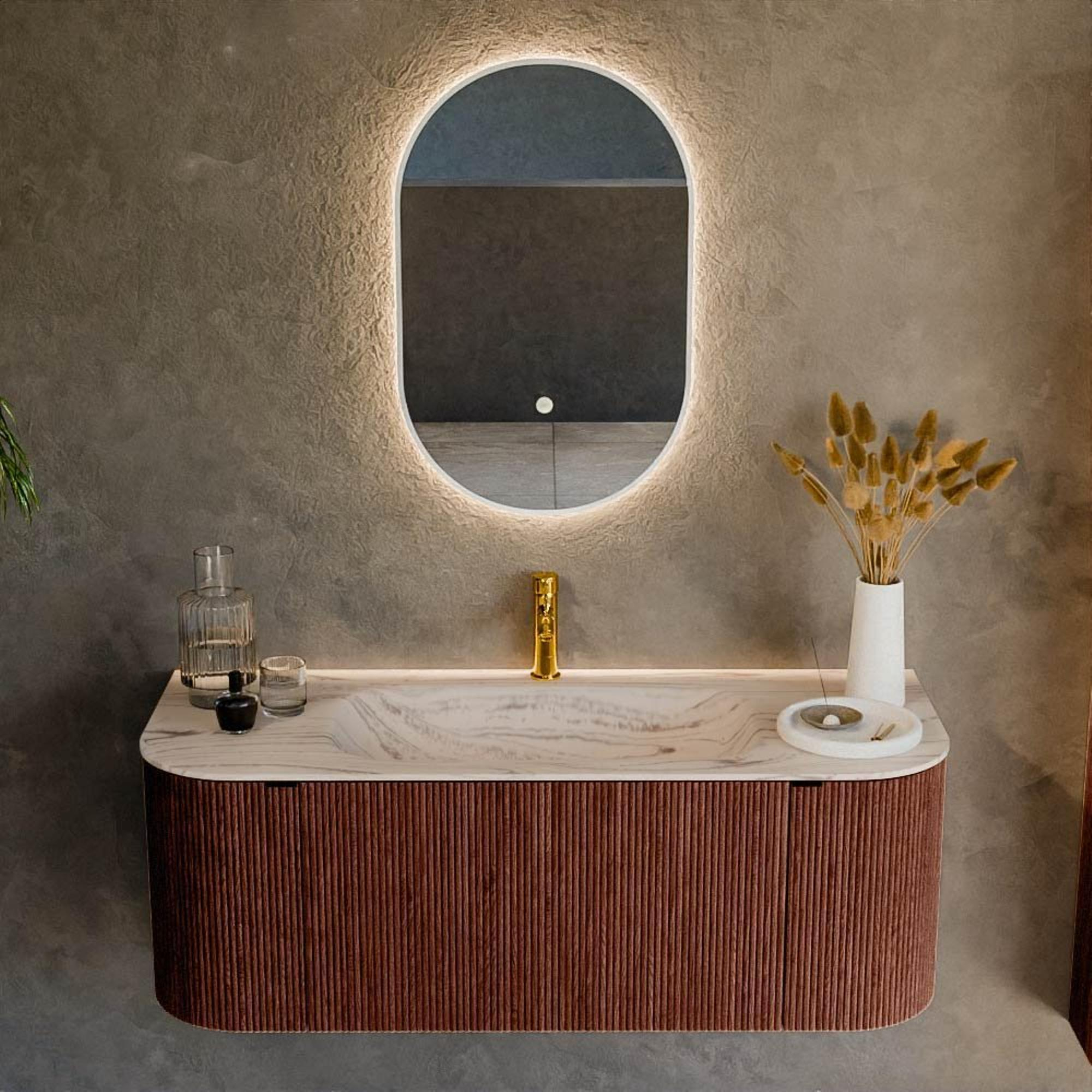 La couleur Ruby profonde donne immédiatement à votre salle de bains une apparence élégante et personnelle. Le meuble forme un contraste puissant avec le lavabo Nata clair, ce qui donne à l'ensemble un aspect moderne et raffiné. Les formes arrondies à gauche et à droite rompent les lignes droites et rendent ce meuble particulièrement adapté à ceux qui souhaitent quelque chose d'un peu différent d'un modèle rectangulaire standard. Dans une salle de bains moderne, hôtel chic ou de style scandinave chaleureux, cette couleur révèle toute sa beauté, surtout en combinaison avec des carreaux clairs, des robinets noirs ou en laiton et des accessoires doux. Ainsi, la zone de lavabo devient une véritable pièce design, sans que l'ensemble ne devienne trop chargé ou criard.