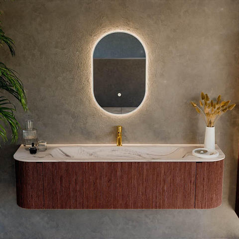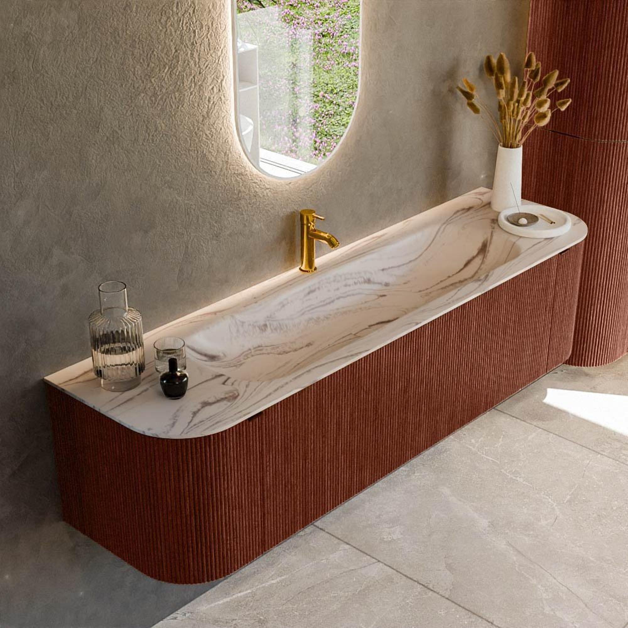 La combinaison des contours arrondis et du ton Ruby profond fait de ce meuble de salle de bains un véritable accroche-regard. Les angles arrondis des deux côtés assurent une ligne fluide le long du mur, ce qui n’est pas seulement esthétique, mais aussi plus sûr et plus agréable à l’usage, surtout pour une famille nombreuse ou un passage plus étroit. La structure à nervures verticales sur les façades donne de la profondeur et une touche de luxe au meuble, ce qui le fait ressortir immédiatement sans être criard. La chaude teinte rouge Ruby se marie parfaitement avec des carreaux neutres, de la robinetterie noire ou au contraire du métal brossé, vous permettant ainsi de créer facilement un concept de salle de bains cohérent. Vous faites ainsi entrer un meuble élégant et intemporel qui donnera à votre salle de bains une apparence haut de gamme pendant de nombreuses années.