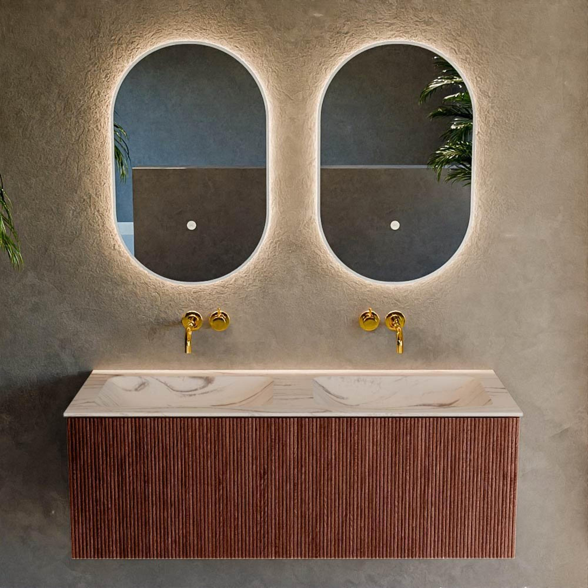 Avec ce meuble de salle de bains généreux, vous apportez un véritable accroche-regard dans votre maison qui donne immédiatement à votre salle de bains une allure luxueuse et designer. La teinte rouge profonde s’intègre parfaitement dans une salle de bains moderne ou de style hôtel chic, mais se combine tout aussi bien avec des tons de bois chaleureux ou un look béton épuré. Grâce à la largeur généreuse de 120 cm et au double lavabo, ce meuble est idéal pour les matinées partagées dans un foyer animé, pour les couples qui aiment commencer la journée ensemble ou pour ceux qui souhaitent simplement un confort et un espace supplémentaires. Les lignes sans poignées, la façade à nervures et le lavabo mince en solid surface assurent un look minimaliste, tandis que le grand tiroir offre plus qu’assez d’espace de rangement pour garder votre salle de bains ordonnée et bien rangée. Vous optez ainsi pour un meuble qui n’est pas seulement agréable à regarder, mais surtout pratique et agréable à utiliser au quotidien.