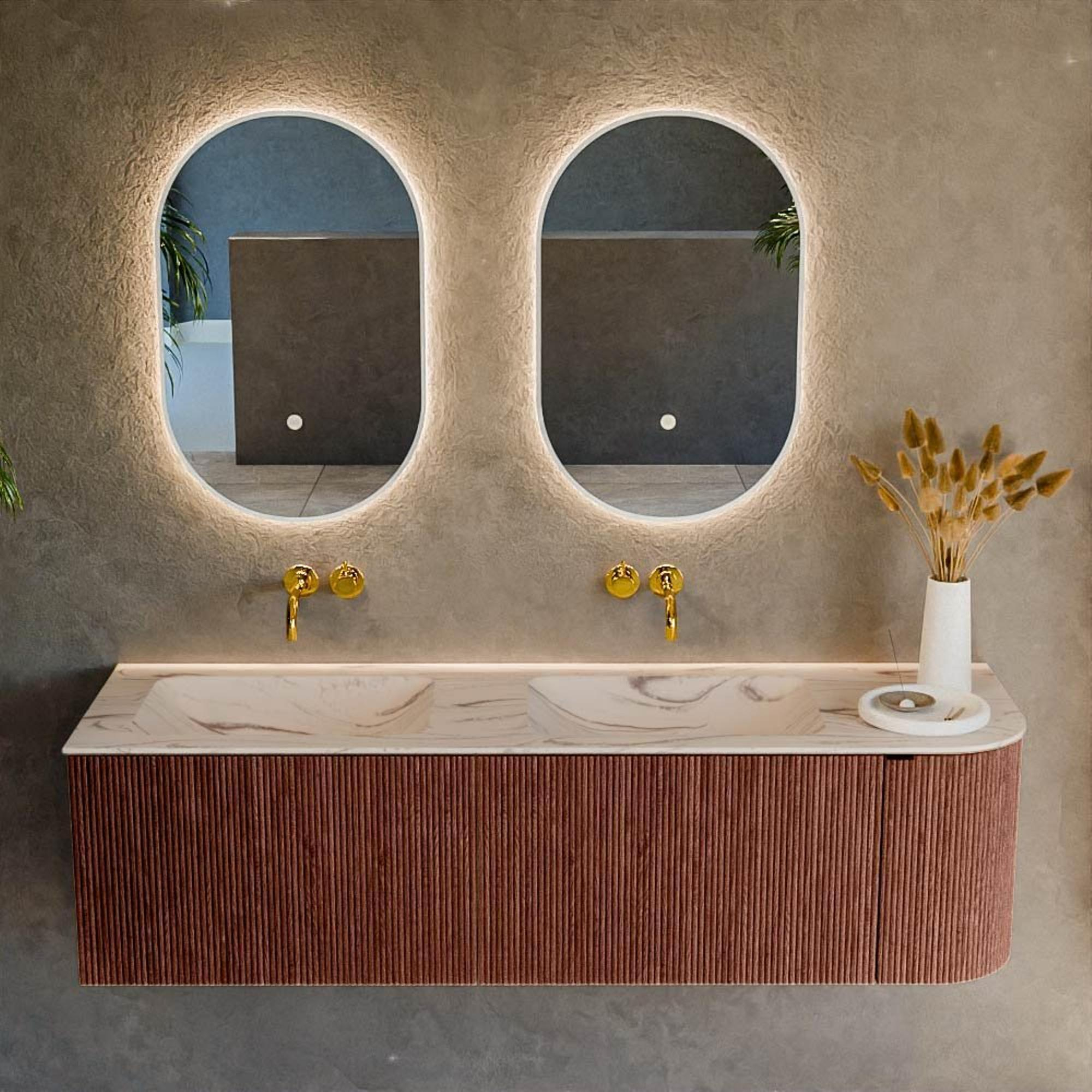 Le léger arrondi sur le côté droit donne au meuble une apparence élégante, presque organique, qui s’intègre parfaitement dans les salles de bains modernes, design ou chics type hôtel. Comme la forme suit la ligne de circulation de la pièce, le passage le long du meuble paraît plus doux et moins anguleux, ce qui est particulièrement agréable dans les salles de bains plus étroites ou à proximité d’un passage vers la douche ou la baignoire. La couleur Ruby s’harmonise parfaitement avec des concepts de couleur riches et chaleureux avec par exemple des accents dorés, noirs ou cuivrés, mais forme aussi un contraste élégant avec des carreaux clairs et sobres. Le lavabo LEAF crème apporte une touche douce et chaleureuse au-dessus du meuble, ce qui rend l’ensemble accueillant et confère immédiatement à votre salle de bains une atmosphère haut de gamme digne d’un design.