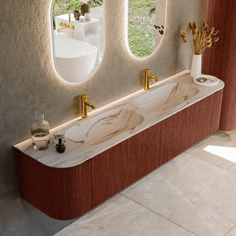 Les courbes douces des côtés gauche et droit confèrent au meuble une forme élégante et fluide qui attire immédiatement le regard et adoucit les lignes plus dures dans la salle de bains. La couleur Ruby profonde ajoute chaleur et luxe, donnant instantanément plus d'ambiance à votre salle de bains. La structure à nervures verticales sur les façades apporte une profondeur et un caractère supplémentaires : la lumière joue subtilement avec la texture et rend le meuble encore plus intéressant à regarder. En combinaison avec le lavabo couleur Nata, il se crée un contraste élégant qui se marie parfaitement avec des robinets et accessoires noirs, chromés ou en métal brossé. Vous créez ainsi facilement un look cohérent et haut de gamme dans toute la pièce.