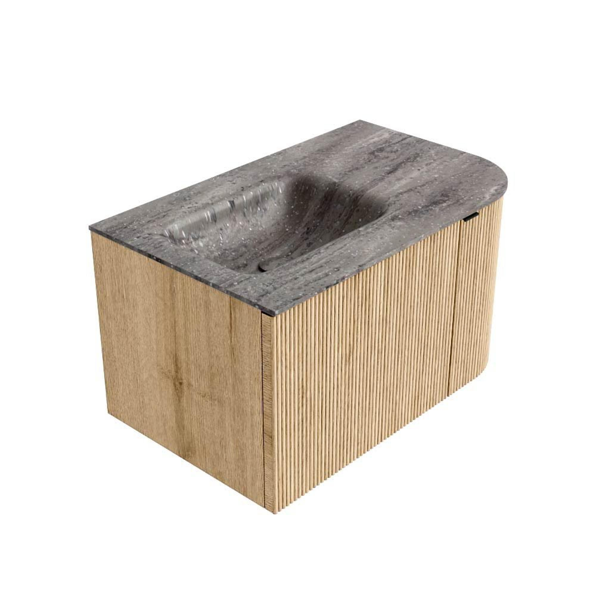 MONDIAZ KURVE-DLUX Meuble de salle de bains 75cm arrondi à droite couleur Oak avec 1 tiroir et 1 porte. Lavabo GRUNNE à gauche sans trou de robinet Oza.