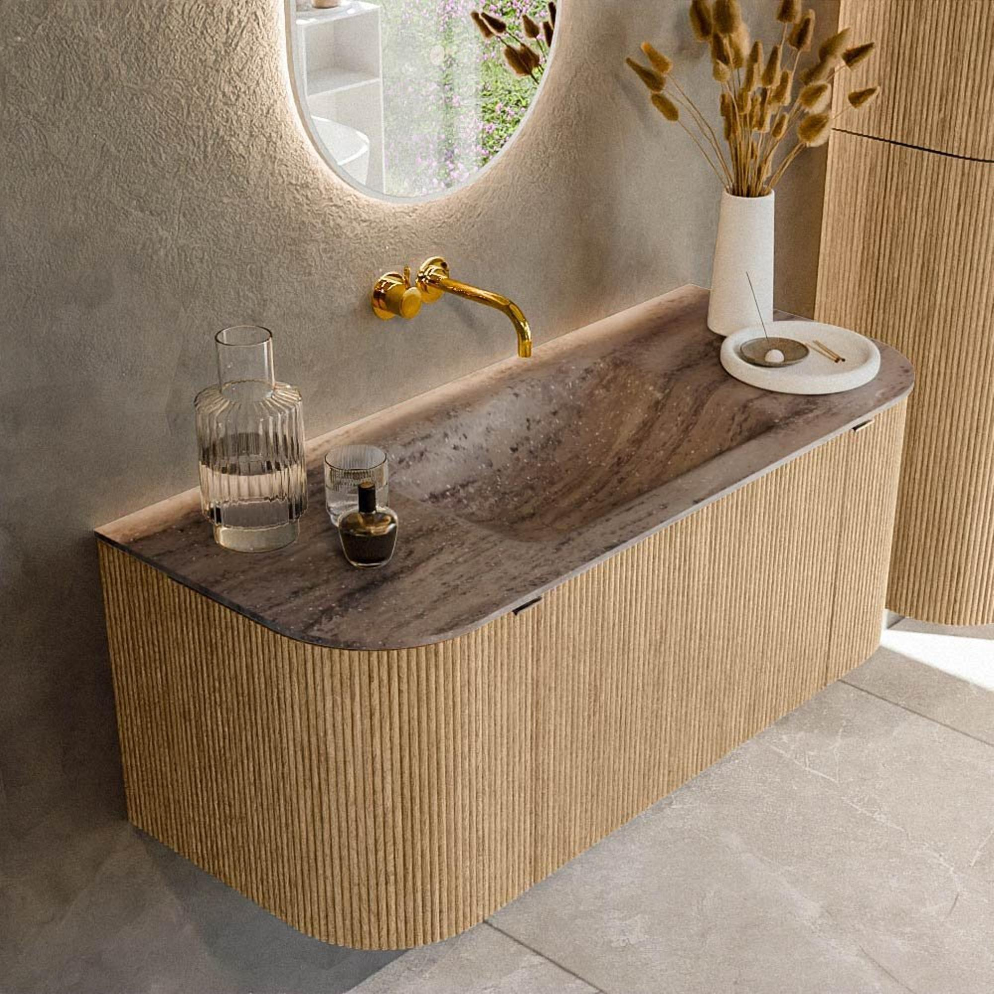 La combinaison d’un meuble rectangulaire aux angles arrondis et de la couleur chêne chaleureuse donne immédiatement à votre salle de bains un caractère naturel et haut de gamme. La structure verticale rainurée des façades ajoute de la profondeur et une touche luxueuse, faisant de ce meuble un véritable élément phare sans être criard. Grâce à sa forme arrondie, l’ensemble paraît plus doux qu’un bloc droit classique et s’harmonise parfaitement avec des miroirs ronds ou des carreaux organiques. Il est donc particulièrement adapté aux salles de bains modernes, type hôtel chic ou d’inspiration scandinave, où calme et harmonie sont au centre. La teinte bois neutre se combine en outre facilement avec des robinets et accessoires noirs, chromés ou en métal brossé, afin que vous puissiez affiner le style entièrement selon vos goûts.
