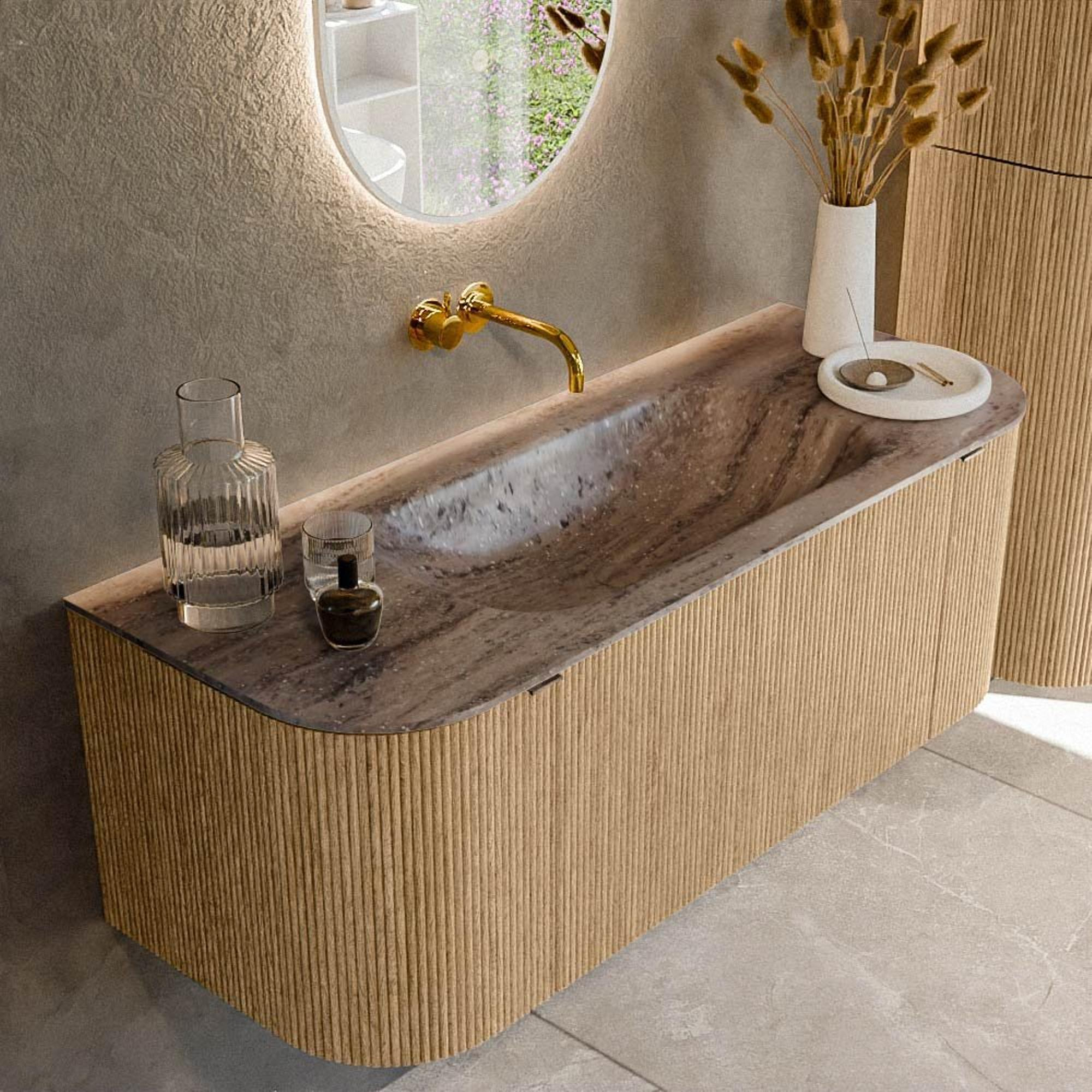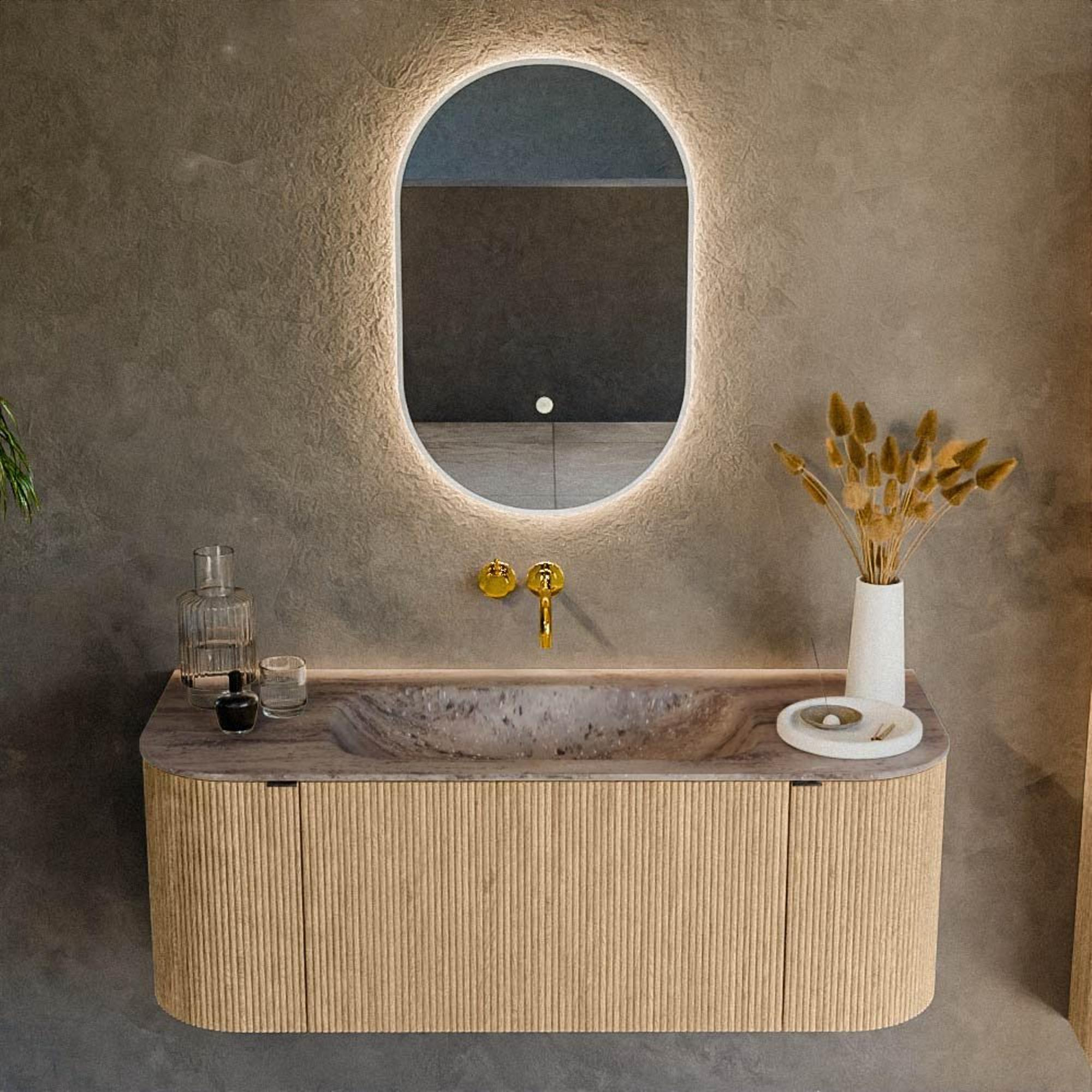 La combinaison des façades épurées avec structure à nervures verticales et des courbes arrondies à gauche et à droite confère à ce meuble un véritable caractère haut de gamme. La teinte chêne apporte chaleur et sérénité naturelle à la pièce, idéale si vous souhaitez créer une salle de bains dans laquelle vous vous détendez dès que vous y entrez. Comme le meuble est suspendu au mur, le sol paraît plus spacieux et l’ensemble de la salle de bains semble plus léger et plus moderne. Les angles arrondis ne sont pas seulement esthétiques, mais aussi pratiques à l’usage, surtout dans les espaces plus étroits ou dans les familles où l’on circule souvent devant le meuble : moins d’angles vifs signifie plus de confort et de sécurité. Vous combinez ainsi design, confort et allure intemporelle en un seul coup d’œil.