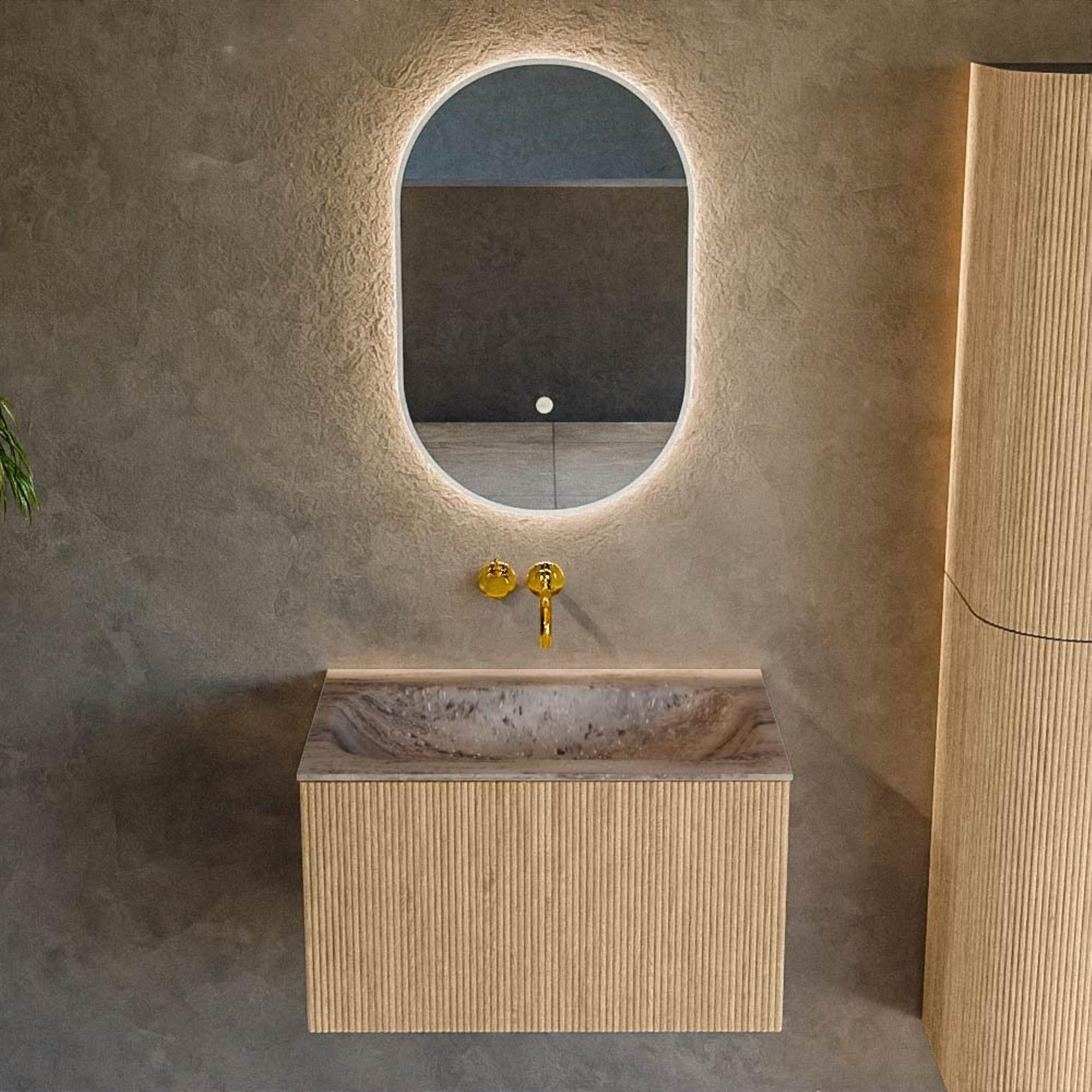 La teinte oak chaleureuse combinée à la façade à nervures verticales confère au meuble une apparence haut de gamme, presque comme un meuble de séjour. Il s’associe parfaitement aux salles de bains modernes, scandinaves ou style hôtel chic et se marie bien avec des robinets et accessoires noirs, laiton ou chromés. La structure 3D sur la face avant ajoute de la profondeur et du luxe supplémentaires, faisant de ce meuble immédiatement le point de mire de la pièce. Grâce à la palette de bruns, la salle de bains paraît chaleureuse et accueillante, sans être chargée ou criarde. Vous créez ainsi une base intemporelle dont vous profiterez pendant des années, même si vous changez plus tard de style avec d’autres accessoires ou carrelages.