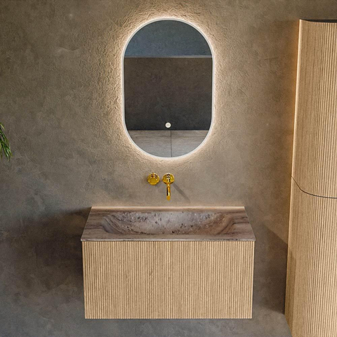 La structure nervurée verticale sur les façades, combinée à la couleur oak, fait de ce meuble un véritable accroche-regard. Le jeu de lignes apporte profondeur et luxe, tandis que la teinte bois naturelle apporte de la chaleur dans la salle de bains. Comme le caisson et la façade sont réalisés dans la même teinte brune, le meuble forme un ensemble homogène qui se marie facilement avec des carreaux blancs, sable, aspect béton ou même des tons sombres profonds. La forme rectangulaire aux angles arrondis s’accorde parfaitement avec les tendances sanitaires modernes, sans se démoder rapidement. Vous créez ainsi une base intemporelle que vous pourrez combiner pendant des années avec différents styles et accessoires.