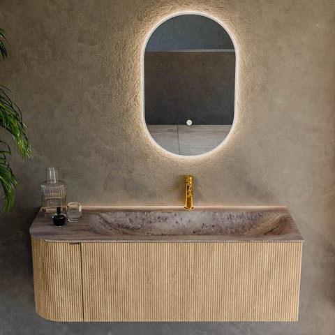 La combinaison d’une forme rectangulaire aux angles arrondis et de la couleur oak donne immédiatement à votre salle de bains une apparence chaleureuse et haut de gamme. La structure à nervures verticales sur la face avant apporte davantage de profondeur et de caractère, sans être criarde. Cela rend le meuble facile à associer avec des carreaux sobres, mais aussi avec des looks béton ou pierre naturelle marqués. L’angle arrondi sur le côté gauche n’est pas seulement élégant, il offre également une sensation douce et sécurisante lors de l’entrée et de la sortie de la salle de bains. Vous faites ainsi entrer chez vous un véritable élément design accrocheur qui reste pourtant intemporel, de sorte que votre salle de bains conserve pendant des années une allure contemporaine.