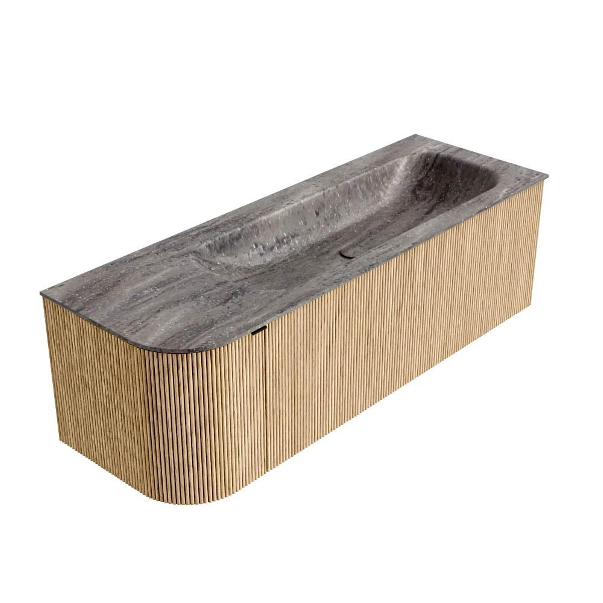 Le meuble est réalisé dans une couleur chêne et appartient à la catégorie bois, ce qui confère immédiatement à votre intérieur une ambiance naturelle et chaleureuse. La structure nervurée verticale des façades apporte un relief supplémentaire et une apparence luxueuse et design que l’on retrouve généralement dans les hôtels haut de gamme. La vasque en solid surface de couleur Oza est épurée, mate et moderne, et offre un toucher agréablement doux. Comme cette version ne possède pas de trou de robinet, vous pouvez choisir vous-même un mitigeur sur gorge assorti à votre style, par exemple noir, chromé ou laiton brossé. Vous composez ainsi facilement un meuble intemporel, mais très personnel.