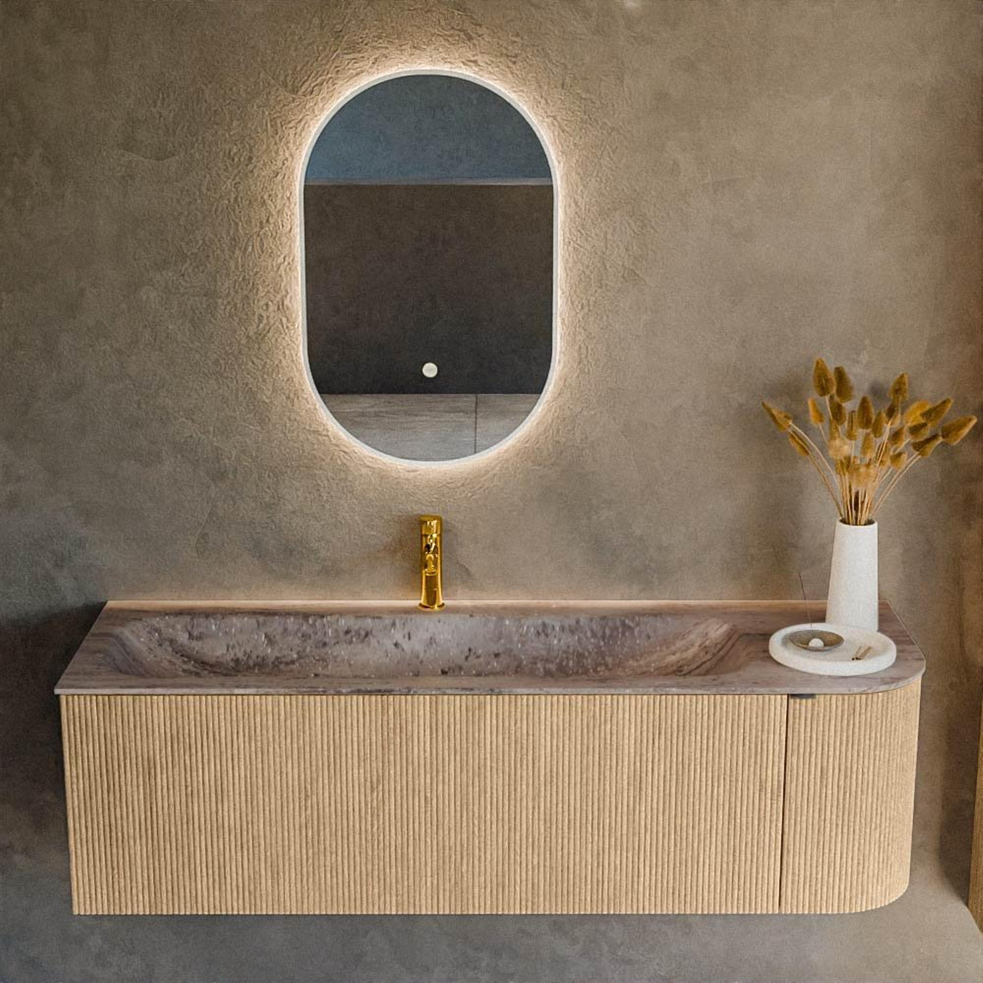 MONDIAZ KURVE-DLUX 145cm badmeubel ronding Rechts kleur Oak met 1 lade en 1 deur. Wastafel BIG LARGE Links 1 kraangat Oza.