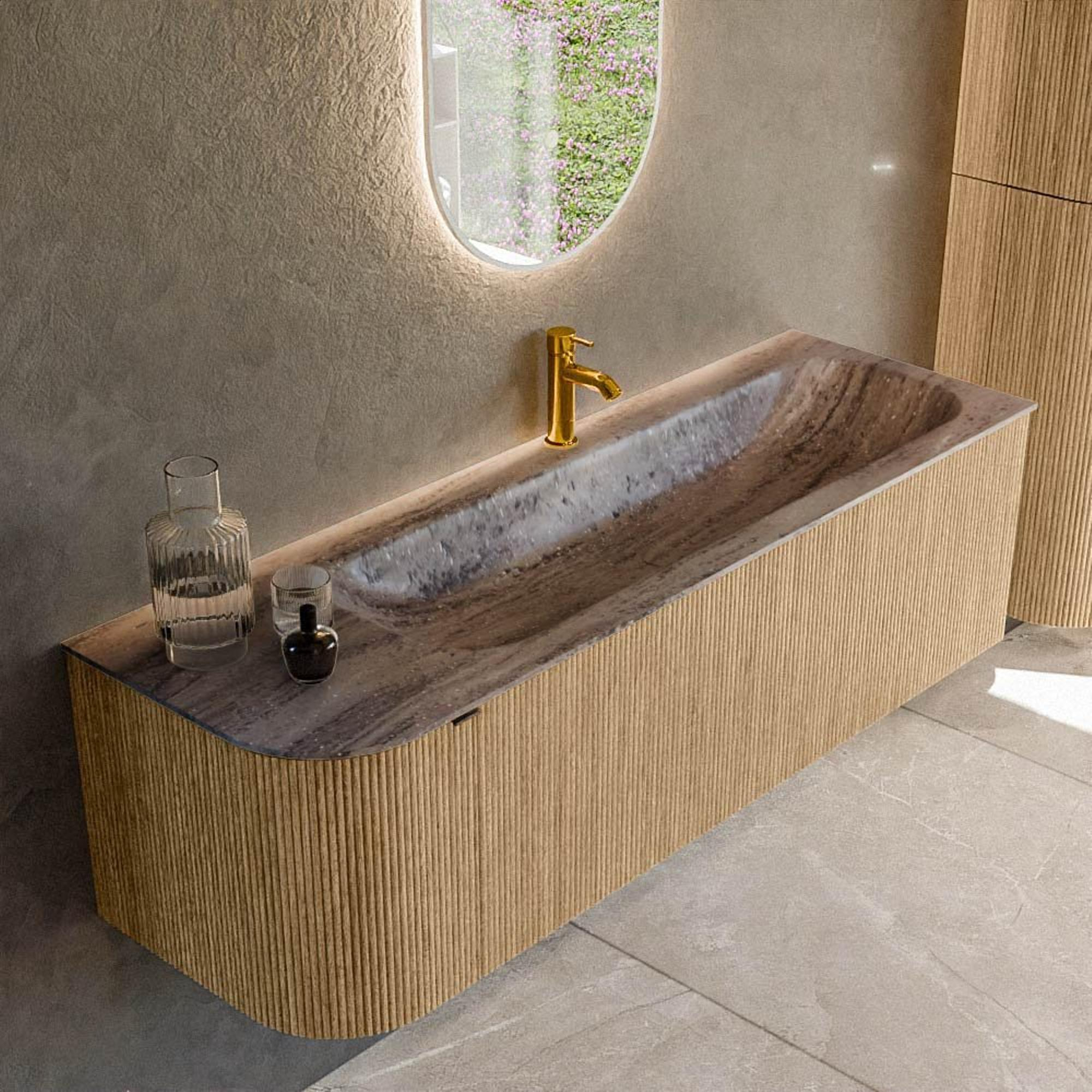 - Couleur chêne avec façade à rainures verticales pour un look chaleureux et luxueux dans différents styles de salle de bains.