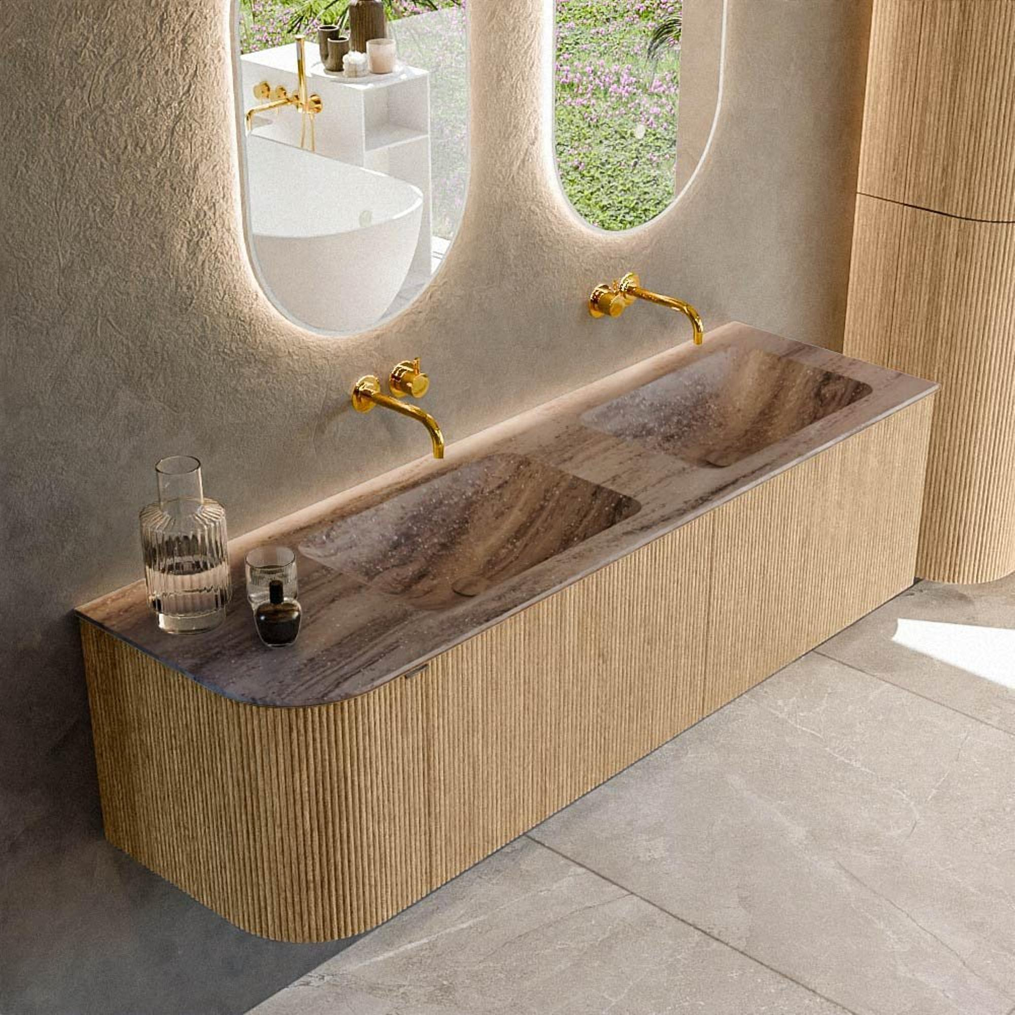 Le côté gauche arrondi crée immédiatement un jeu de lignes fluide et agréable dans votre salle de bains. Pas d’angles vifs le long desquels vous passez, mais une courbe élégante qui donne au meuble un véritable aspect design. La couleur chêne avec structure à nervures verticales sur les façades souligne le caractère naturel et ajoute de la chaleur à un espace qui peut parfois paraître un peu froid. Cela facilite la combinaison de l’ensemble avec des robinets noirs, des carreaux blancs ou au contraire un aspect béton et pierre naturelle. Comme le plan et les vasques sont réalisés dans une couleur moderne et apaisante, il en résulte un beau contraste sans que cela devienne chargé. Vous créez ainsi une base intemporelle qui peut évoluer pendant des années avec différents styles et accessoires.