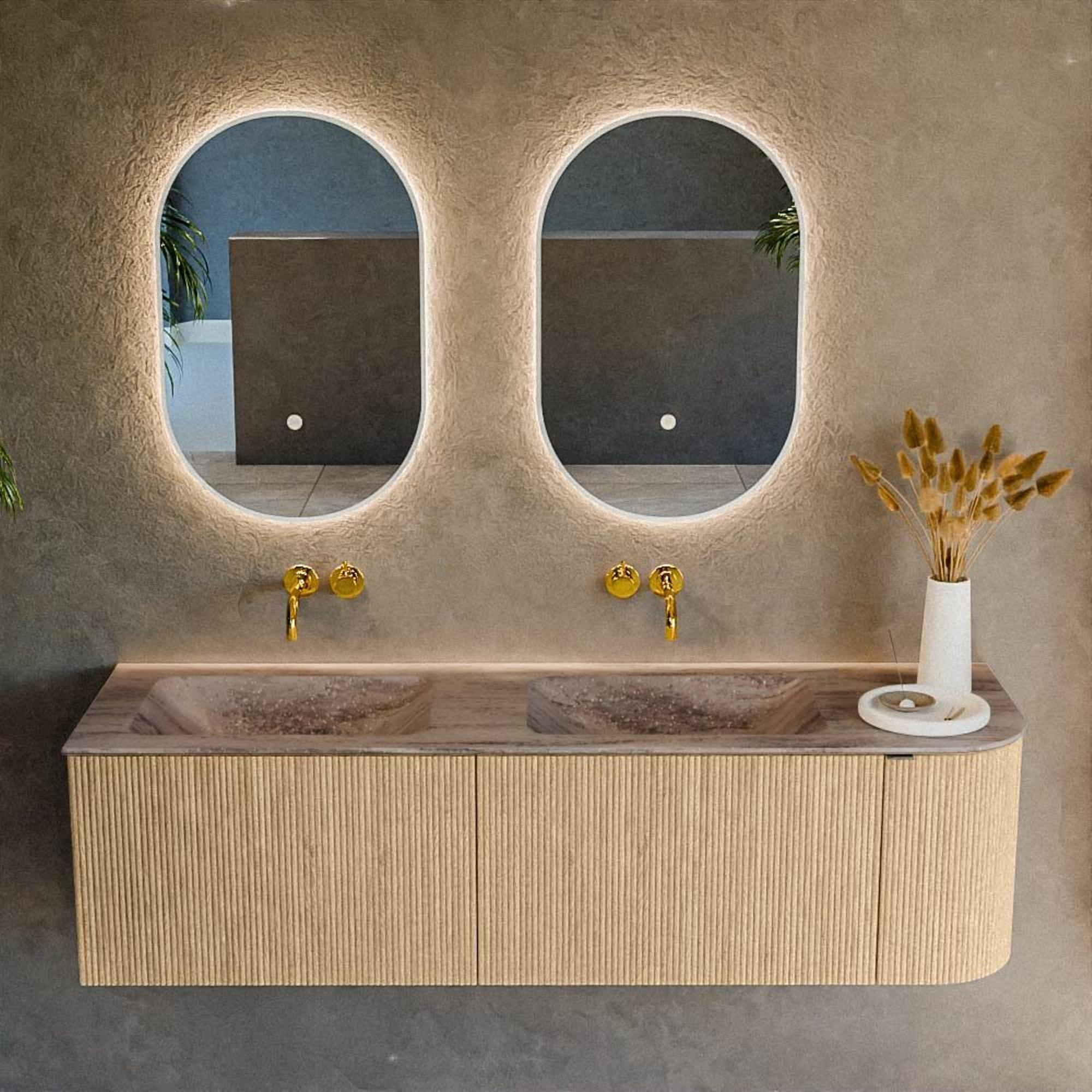 MONDIAZ KURVE-DLUX 155cm badmeubel ronding Rechts kleur Oak met 2 lades en 1 deur. Wastafel LEAF Dubbel / Links zonder kraangat Oza.