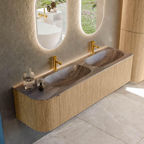 Vous recherchez un meuble de salle de bains spacieux qui donne à votre salle de bains une apparence chaleureuse digne d'un hôtel ? Alors ce meuble est un choix très judicieux. Avec sa largeur généreuse, il est idéal pour les grandes salles de bains ou pour ceux qui aiment commencer la journée à deux sans se gêner. La combinaison d'un arrondi organique sur le côté gauche, de la couleur bois chaude et du lavabo double aux lignes épurées crée un contraste élégant qui s'intègre parfaitement dans les salles de bains modernes, scandinaves ou naturelles. Grâce à l'agencement pratique avec deux tiroirs et une porte de placard, vous disposez de plus qu'assez d'espace de rangement pour garder vos affaires quotidiennes bien hors de vue, tandis que le plan avec double vasque offre beaucoup d'espace pour effectuer confortablement vos routines quotidiennes.