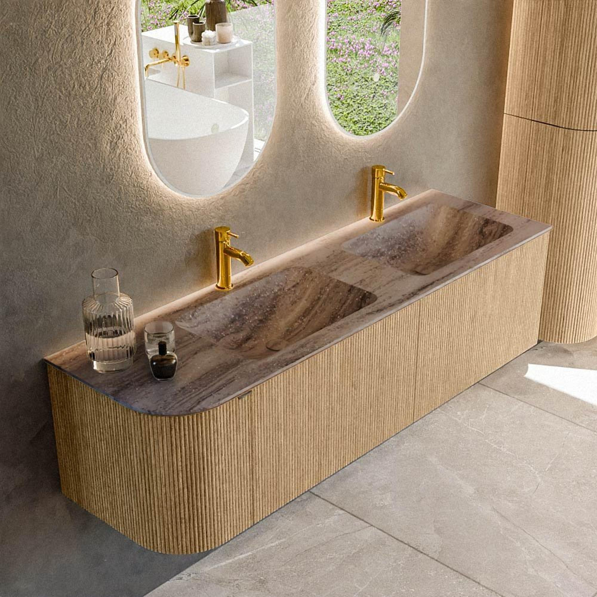 MONDIAZ KURVE-DLUX 155cm badmeubel ronding Links kleur Oak met 2 lades en 1 deur. Wastafel LEAF Dubbel / Rechts 2 kraangaten Oza.