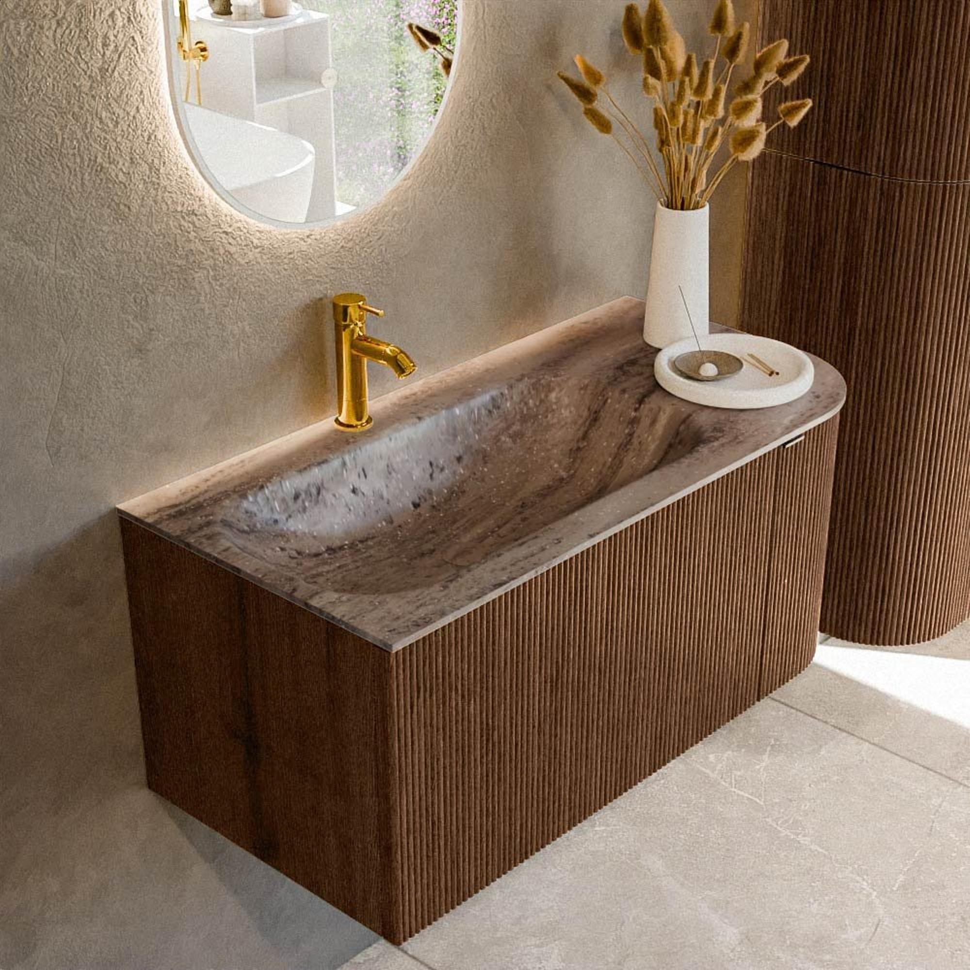 La finition coloris noyer avec aspect bois, combinée à la façade à nervures verticales, confère une sensation de luxe évidente, comparable à l’ambiance des hôtels de design. La façade n’est pas seulement agréable à regarder, elle ajoute aussi de la profondeur et de la texture à votre salle de bains, faisant de ce meuble un véritable point de mire sur le mur. La teinte bois se marie aussi bien avec des robinets et accessoires blancs que noirs, mais aussi avec des tons naturels doux ou au contraire avec un look béton et acier plus industriel. Parce que la couleur appartient à une gamme de teintes bois, elle apporte chaleur et sérénité à la pièce, idéal si vous aimez un style naturel et intemporel. Vous créez ainsi facilement une base harmonieuse dont vous profiterez pendant de nombreuses années.
