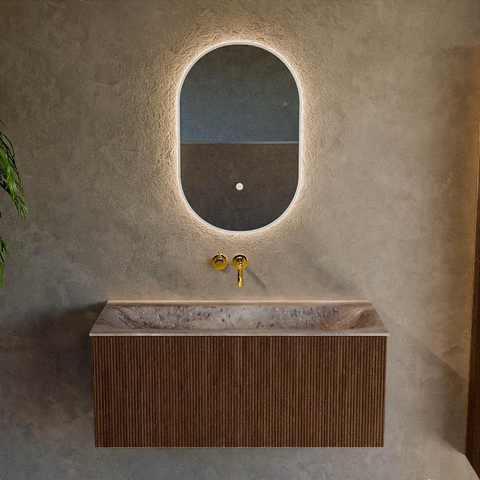 La couleur noyer combinée à la façade à rainures verticales donne une apparence luxueuse de véritable mobilier qui apporte immédiatement plus d’ambiance et de caractère à votre salle de bains. La teinte bois se marie à merveille avec les intérieurs modernes, scandinaves et style hôtel chic, et se combine facilement avec des robinets et accessoires noirs, blancs ou métalliques. Les formes arrondies du meuble comme du lavabo adoucissent les lignes épurées et rendent l’ensemble chaleureux et accueillant. Comme le meuble est suspendu au mur, le sol reste dégagé et votre salle de bains paraît optiquement plus spacieuse et plus calme – un choix judicieux si vous accordez de l’importance à un look épuré et ordonné.