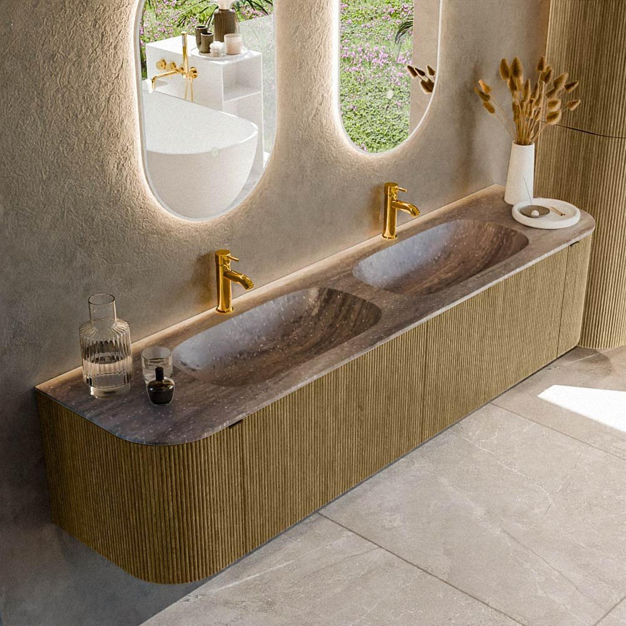 - Double vasque STOR SMALL en solid surface couleur Oza avec 2 trous de robinet pour une utilisation double confortable.