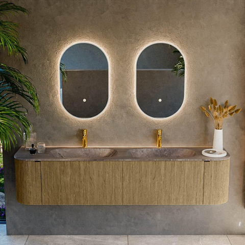 Ce meuble de salle de bains spacieux de 190 cm est idéal si vous disposez d'une salle de bains généreuse et que vous recherchez une solution élégante et fonctionnelle pour deux personnes. Grâce à la combinaison d'une teinte bois chaude, d'un plan-vasque raffiné et d'un espace de rangement astucieux, vous créez un aspect calme et ordonné, tout en disposant de suffisamment de place pour toutes vos affaires de salle de bains quotidiennes. La double vasque avec deux trous de robinet rend l'utilisation simultanée aux heures de pointe du matin et du soir particulièrement confortable, que vous ayez une vie de famille trépidante ou que vous souhaitiez simplement profiter ensemble d'une atmosphère d'hôtel de luxe à la maison. Grâce aux formes arrondies, l'ensemble paraît plus doux qu'un meuble droit standard, ce qui s'intègre parfaitement dans les salles de bains modernes, scandinaves et design où le confort et l'élégance se rejoignent.