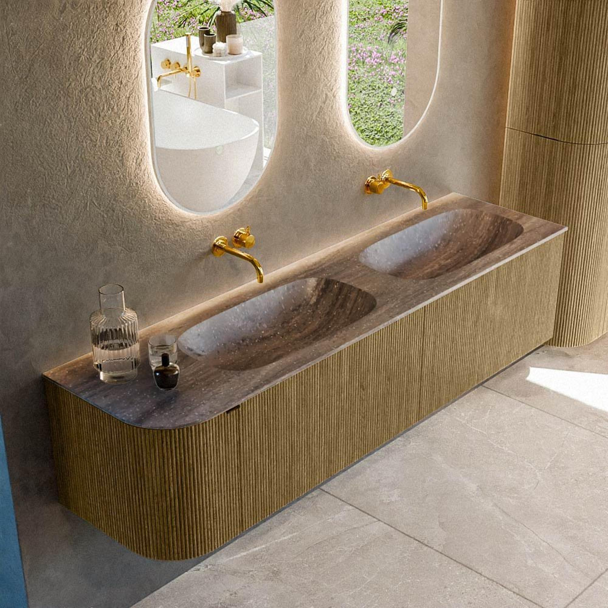 Ce meuble de salle de bains spacieux est un excellent choix si vous souhaitez créer une grande salle de bains familiale luxueuse ou une master bathroom digne d’un hôtel, tout en accordant de l’importance aux lignes épurées et à une répartition bien pensée. Avec sa largeur généreuse de 175 cm, son élégante courbe sur le côté gauche et son double lavabo, il offre tout l’espace nécessaire pour les matinées chargées, sans que vous ne vous gêniez mutuellement. La teinte chaude Dusk et la façade nervurée confèrent une apparence haut de gamme digne d’un véritable intérieur, qui se marie à merveille avec des matériaux naturels, des accents noirs ou au contraire avec de la céramique blanche douce. Grâce à la pose murale, l’ensemble paraît léger et aéré, idéal aussi bien pour les grandes salles de bains que pour les espaces intelligemment agencés où vous souhaitez conserver une certaine tranquillité visuelle. Si vous recherchez un meuble élégant avec beaucoup d’espace de rangement, un double lavabo pratique et un design qui durera des années, cette solution correspond parfaitement à vos attentes.