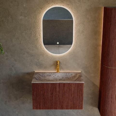 La couleur Ruby en combinaison avec la façade rainurée verticale donne à ce meuble une apparence luxueuse, quasiment digne d'un hôtel. Les façades sont réalisées dans une finition bois de haute qualité, ce qui ajoute chaleur et ambiance à votre salle de bains, tandis que les lignes épurées et la forme rectangulaire s'intègrent parfaitement dans un aménagement moderne ou axé sur le design. La structure rainurée verticale crée en outre des jeux de lumière ludiques, de sorte que le meuble a l'air légèrement différent à tout moment de la journée. Combinez-le avec des robinets et des accessoires noirs, chromés ou couleur laiton pour compléter votre style souhaité - de l'industriel au chic.