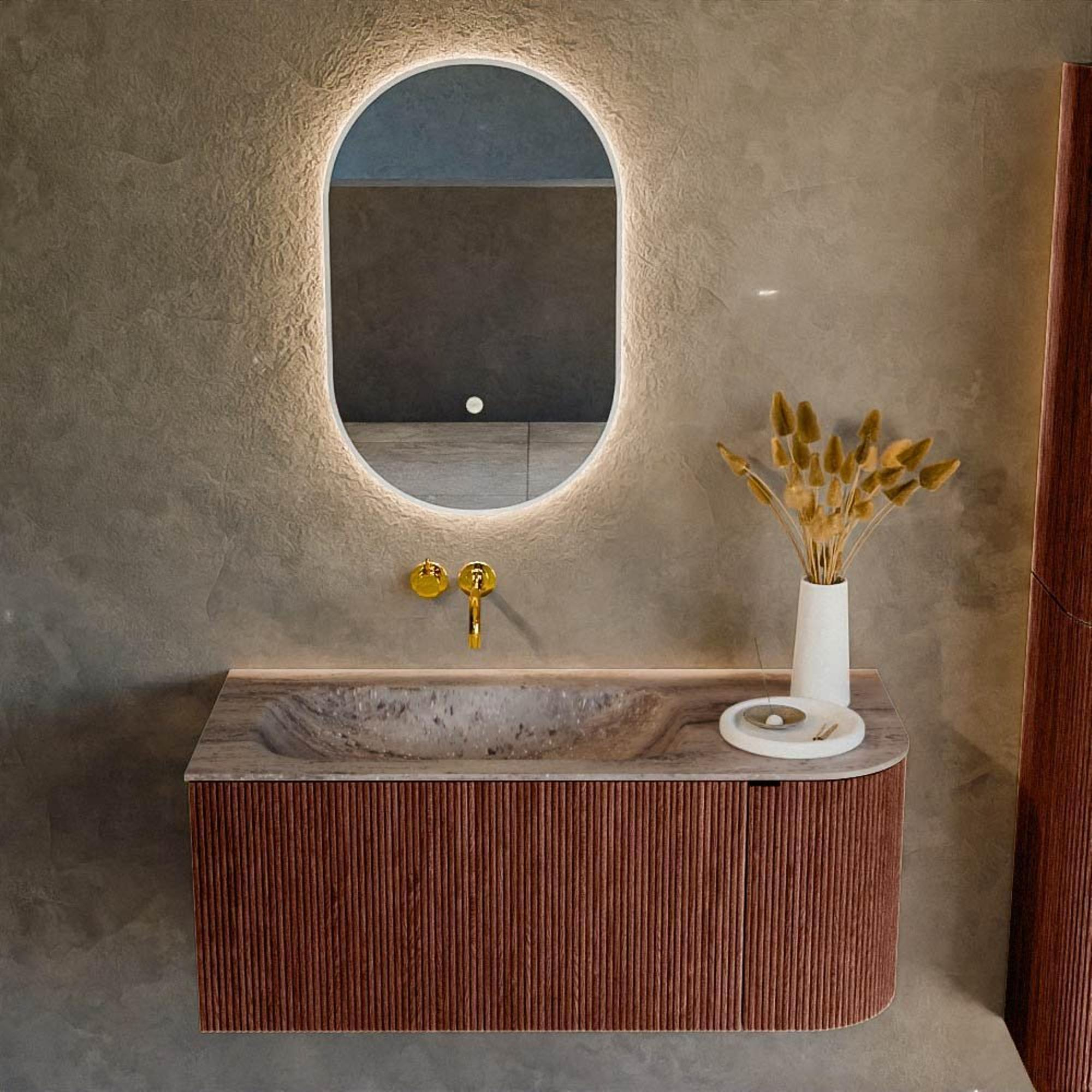 Le côté droit arrondi et les lignes épurées confèrent à ce meuble un design moderne, digne d’un hôtel. La couleur Ruby profonde y ajoute une touche de luxe et de chaleur, donnant immédiatement à votre salle de bains une apparence plus riche et plus personnelle. Les façades rainurées avec structure verticale apportent davantage de profondeur et un jeu de lumière ludique, surtout en combinaison avec un bon éclairage de salle de bains. Grâce au montage mural, le meuble semble flotter, libérant le sol et agrandissant visuellement l’espace. Vous faites ainsi entrer chez vous une pièce de design qui n’est pas seulement agréable à regarder, mais qui s’intègre aussi parfaitement dans les salles de bains contemporaines à l’allure élégante et actuelle.