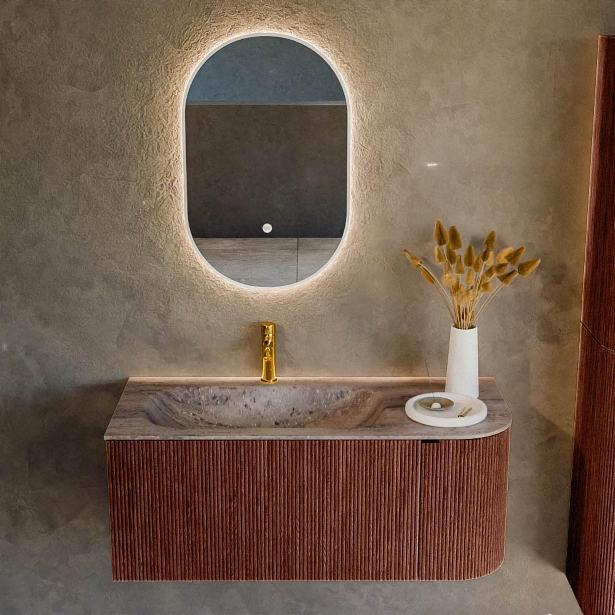 La teinte Ruby profonde donne à ce meuble un caractère marqué et chaleureux qui apporte immédiatement de l'ambiance à votre salle de bains. La forme arrondie sur le côté droit adoucit les lignes et rend l'ensemble moins anguleux, ce qui est idéal lorsque vous passez le long du meuble ou lorsqu'il est placé près de la porte. La structure à nervures sur la façade crée une profondeur et un luxe supplémentaires, de sorte que le meuble n'est pas seulement beau à regarder, mais possède également une véritable apparence design. Grâce à la combinaison de la couleur, de la texture et de la forme, c'est un choix parfait si vous souhaitez donner à votre salle de bains une touche unique et personnelle sans sacrifier l'élégance intemporelle.