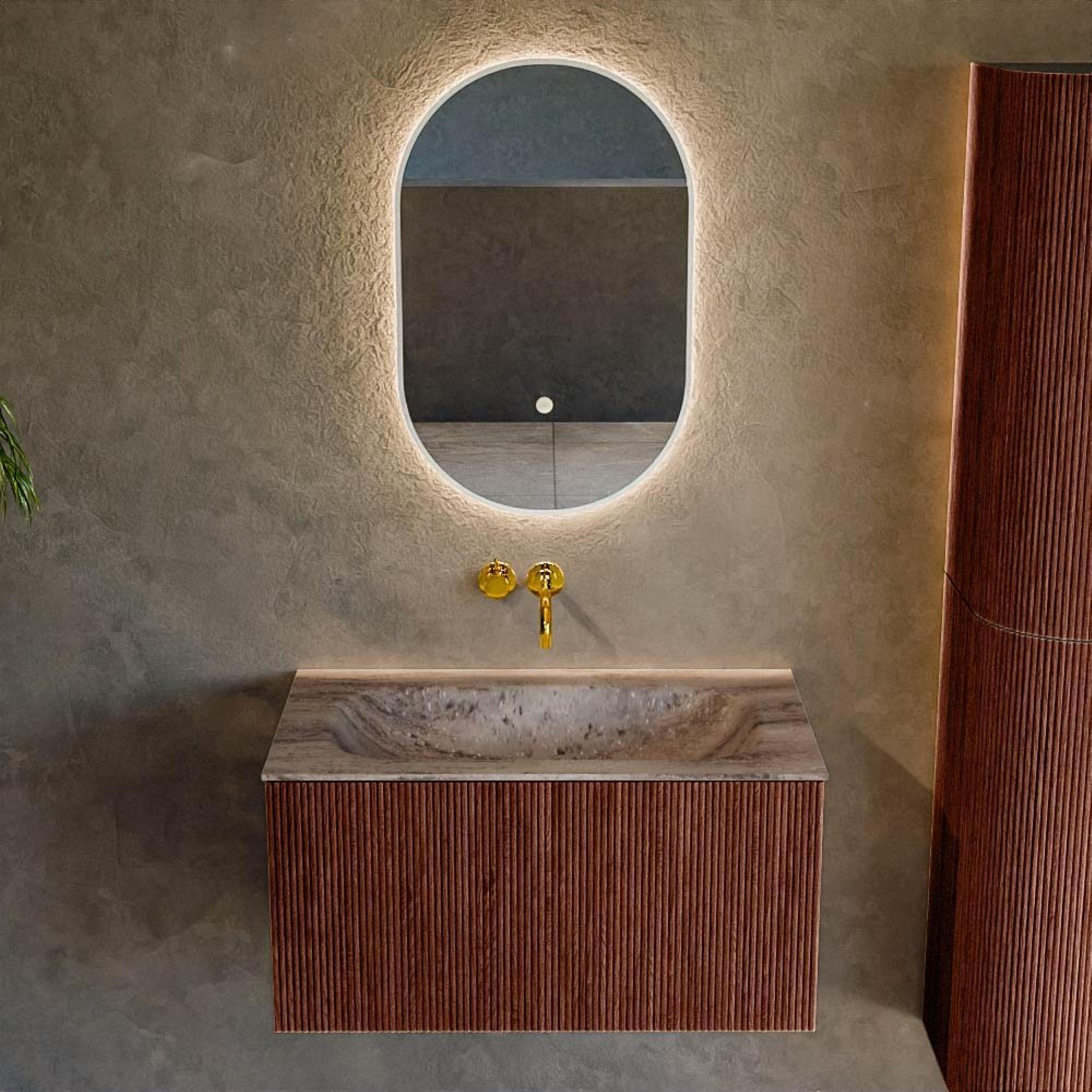 La teinte Ruby profonde donne immédiatement du caractère à votre salle de bains et lui confère une apparence luxueuse. Associée à la forme rectangulaire épurée et aux lignes subtilement arrondies, elle crée un meuble moderne qui dégage calme et chaleur. La structure nervurée verticale sur la façade apporte de la profondeur et une ambiance d’hôtel chic, sans donner une impression de surcharge visuelle. Cela rend le meuble particulièrement adapté comme pièce maîtresse sous un grand miroir, tout en restant léger visuellement dans un espace compact grâce au montage mural. Associez la couleur Ruby à des robinets noirs ou dorés pour un look affirmé, ou à du chrome et du blanc pour un ensemble intemporel et apaisant.