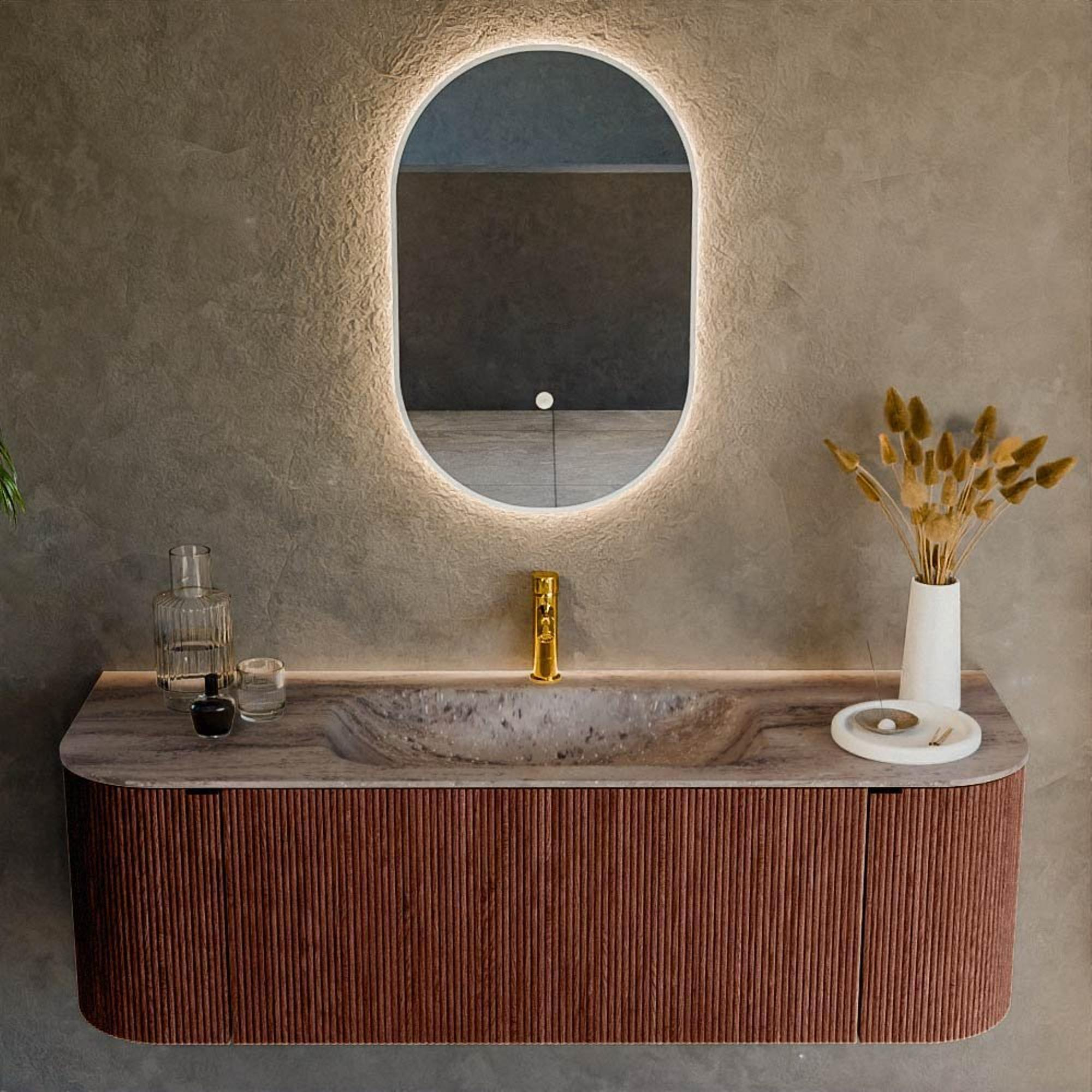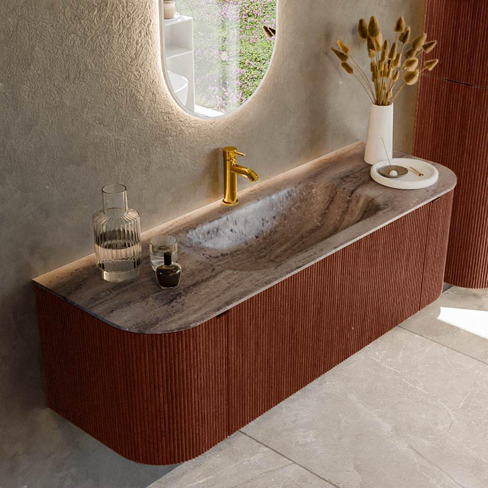La forme arrondie de ce meuble adoucit les lignes de votre salle de bains et apporte immédiatement une apparence plus luxueuse. Les façades arrondies suivent subtilement la ligne de circulation dans la pièce, ce qui est particulièrement agréable dans les salles de bains où l'on passe le long du meuble en entrant. La couleur Ruby profonde ajoute de la chaleur et de la personnalité sans être criarde. En combinaison avec des carreaux clairs, un contraste élégant est créé, tandis que des murs sombres apportent au contraire une atmosphère intime, façon hôtel. Les façades à nervures avec structure verticale donnent une profondeur supplémentaire et un aspect haut de gamme, ce qui rend ce meuble parfait pour une salle de bains design moderne où vous voulez vraiment installer quelque chose d'unique.