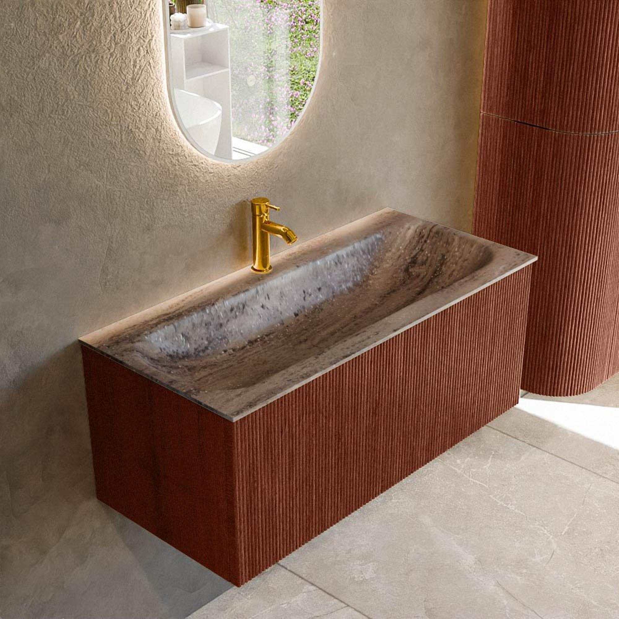 Avec ce meuble de salle de bains compact mais remarquable, vous donnez immédiatement à votre salle de bains un aspect luxueux et personnalisé. La chaleureuse couleur Ruby et la façade rainurée ludique en font un véritable accroche-regard, tandis que les lignes épurées s’intègrent aisément dans les salles de bains modernes et design. Grâce à sa largeur de 100 cm, c’est un choix idéal aussi bien pour les salles de bains de taille moyenne que pour les toilettes spacieuses où vous souhaitez juste un peu plus de confort et d’espace de rangement. La combinaison d’un tiroir pratique et d’un lavabo placé au centre assure une composition calme et claire. Si vous recherchez un meuble qui réunit style, facilité d’utilisation et qualité sans écraser votre espace, alors c’est un choix particulièrement judicieux.