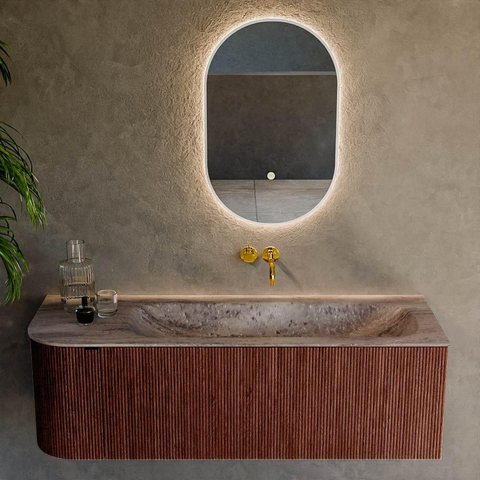 L’arrondi caractéristique à gauche confère à ce meuble une forme élégante et organique qui donne immédiatement plus d’allure à votre salle de bains. La couleur Ruby chaleureuse (une teinte de rouge raffinée) crée une apparence riche et luxueuse et se marie à merveille avec des carreaux en marbre clair comme avec des aspects pierre naturelle foncés. La structure verticale rainurée des façades apporte une profondeur et une texture supplémentaires, de sorte que le meuble constitue déjà à lui seul un élément de design, même sans accessoires trop présents. Comme le meuble est monté en suspension au mur, la pièce semble optiquement plus grande et le sol reste dégagé ; cela donne non seulement une impression plus spacieuse, mais rend également le nettoyage autour du meuble beaucoup plus facile.