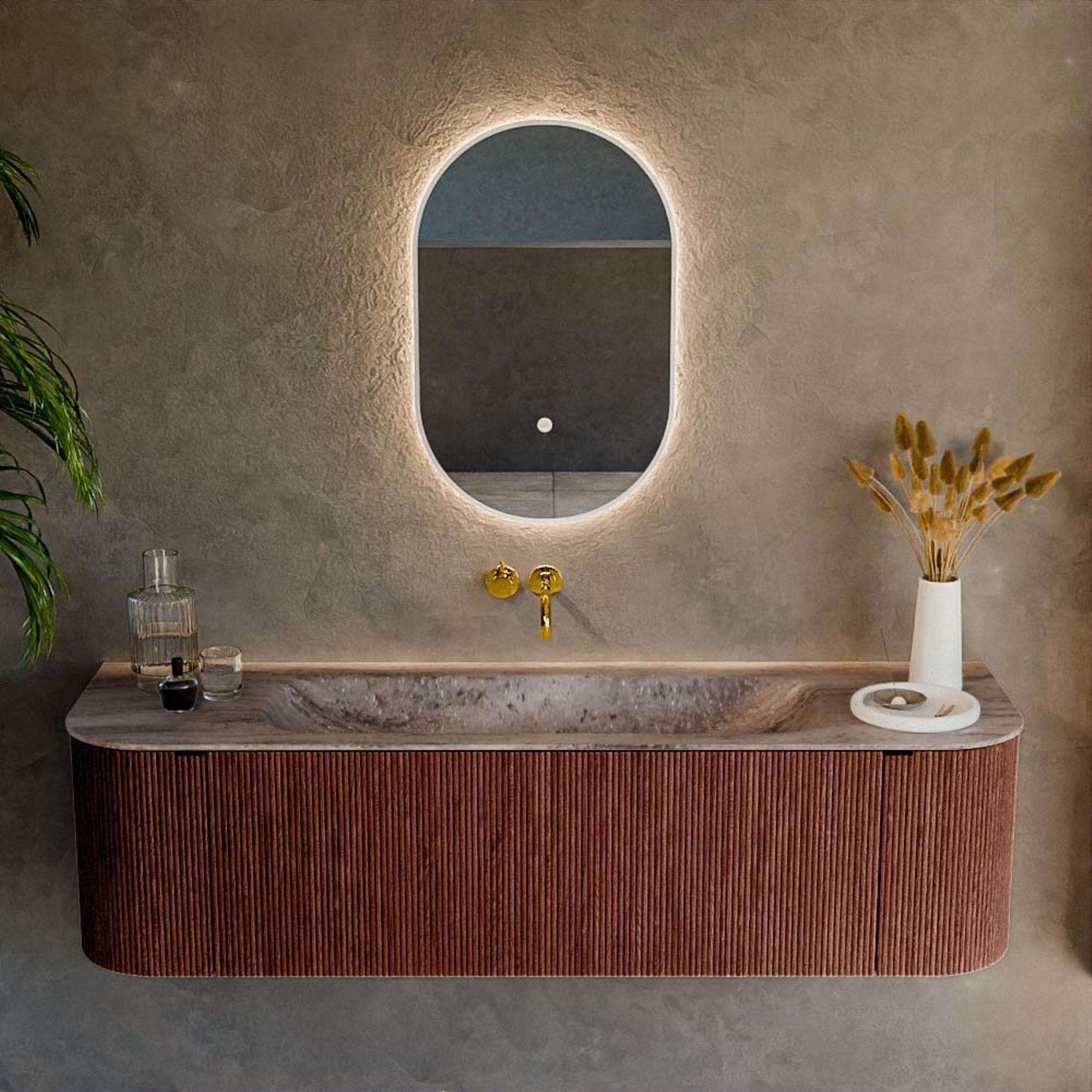 Les angles arrondis à gauche et à droite donnent au meuble une apparence unique et luxueuse que l'on ne retrouve pas dans toutes les salles de bains. La couleur ruby forme un accent chaud, rouge profond, qui se marie à merveille avec des carreaux neutres, des accents noirs ou des robinets dorés. Ainsi, ce meuble s'intègre sans effort aussi bien dans les salles de bains modernes que dans les salles de bains aménagées de manière plus chaleureuse. La longueur de 160 cm crée une apparence généreuse le long du mur, sans que le meuble ne paraisse massif ; les arrondis adoucissent l'ensemble et l'allègent visuellement. Vous créez ainsi un véritable accroche-regard qui donne d'un coup une touche de luxe à votre salle de bains, sans faire de concessions sur la fonctionnalité.