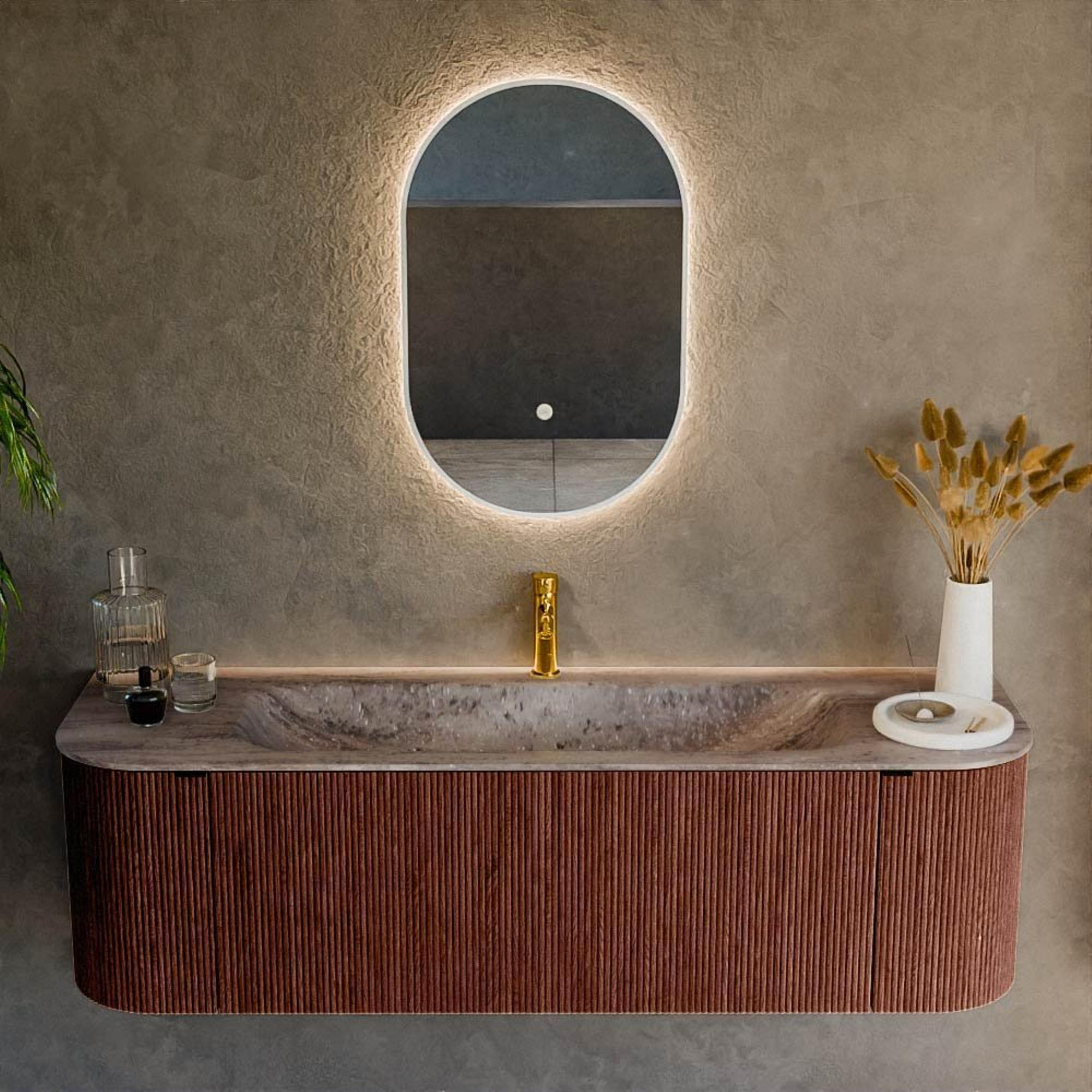 La combinaison des angles arrondis à gauche et à droite et de la façade épurée confère à ce meuble une apparence unique et haut de gamme. La forme n’est pas seulement élégante, mais aussi pratique : vous vous cognez moins facilement contre des angles vifs, ce qui est particulièrement appréciable dans une salle de bains familiale très fréquentée ou dans un espace plus réduit où l’on passe près du meuble. La couleur Ruby fait du meuble sous-vasque une déclaration de style qui donne immédiatement du caractère à votre salle de bains, sans être criarde. Grâce à la dimension de 150 cm, vous disposez d’une zone de lavabo généreuse qui convient parfaitement aux salles de bains de taille moyenne à grande. Vous créez ainsi une ambiance d’hôtel de luxe chez vous, avec un meuble qui devient immédiatement le point central de la pièce.