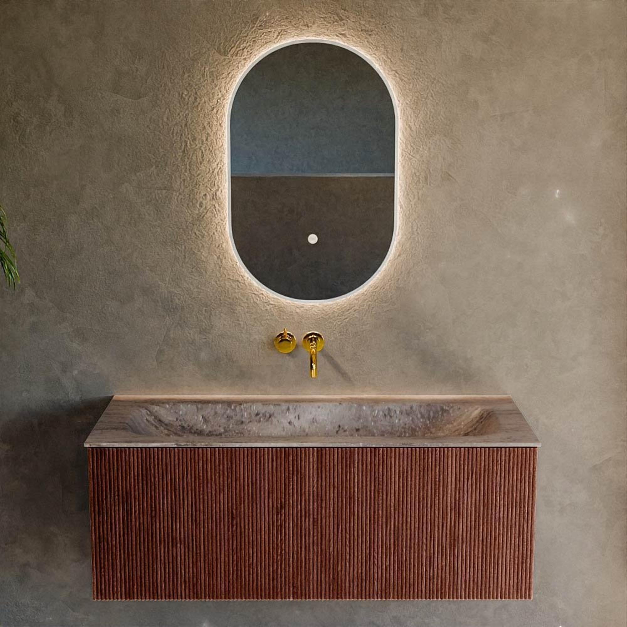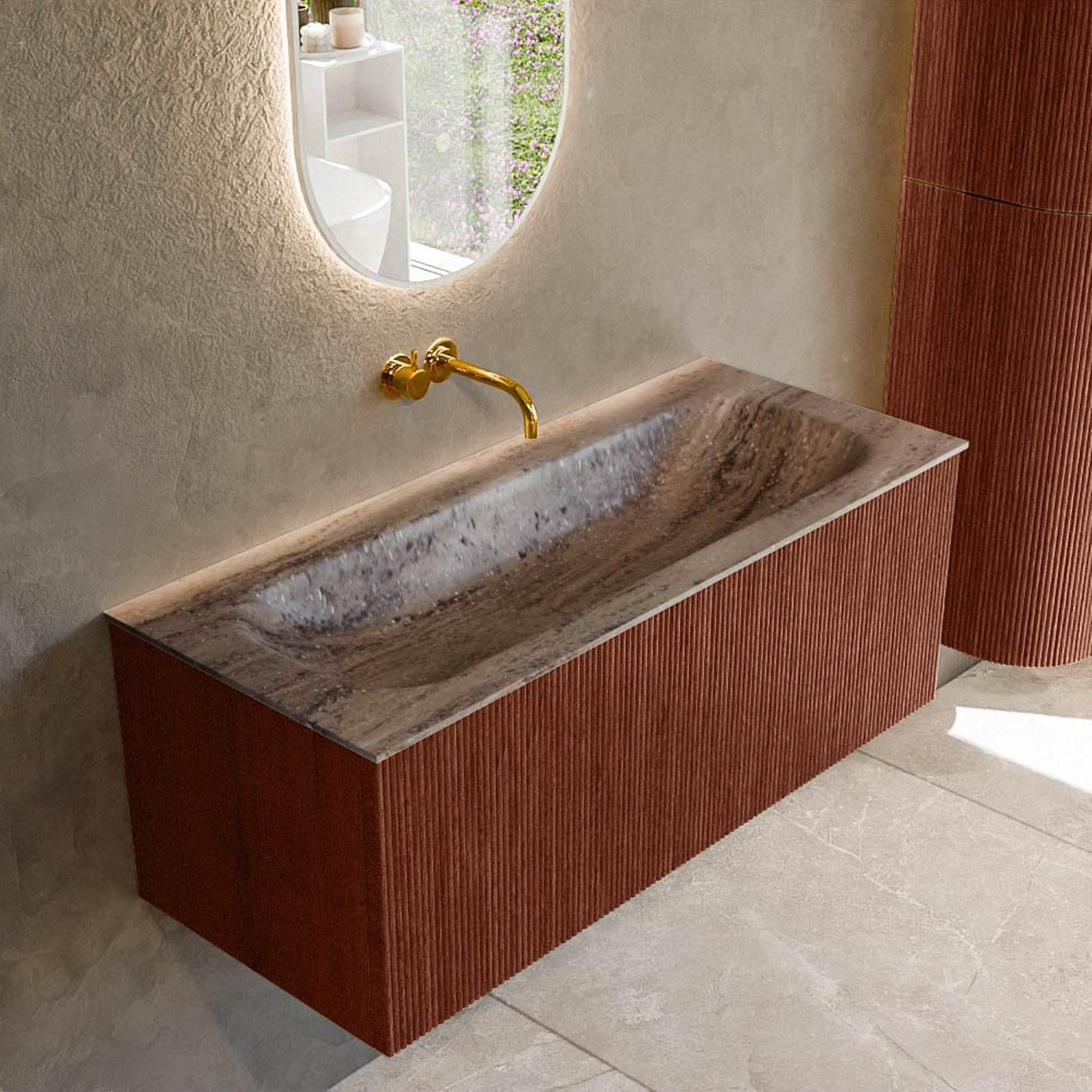 La teinte Ruby profonde combinée à la façade à nervures verticales donne immédiatement à votre salle de bains un aspect luxueux de boutique-hôtel. Les façades se prolongent en une seule ligne épurée, ce qui crée une image calme et moderne, même si le mur arrière est carrelé de façon plus chargée. La structure 3D capte la lumière de manière subtile, de sorte que le meuble paraît légèrement différent à tout moment de la journée. Vous créez ainsi un véritable accroche-regard sans que ce soit criard. Grâce à la couleur de vasque neutre Oza, vous combinez ce meuble sans effort avec des robinets et accessoires noirs, chromés, dorés ou colorés. Vous pouvez ainsi peaufiner entièrement le style de votre salle de bains – industriel, hôtel chic ou moderne minimaliste – selon vos envies.