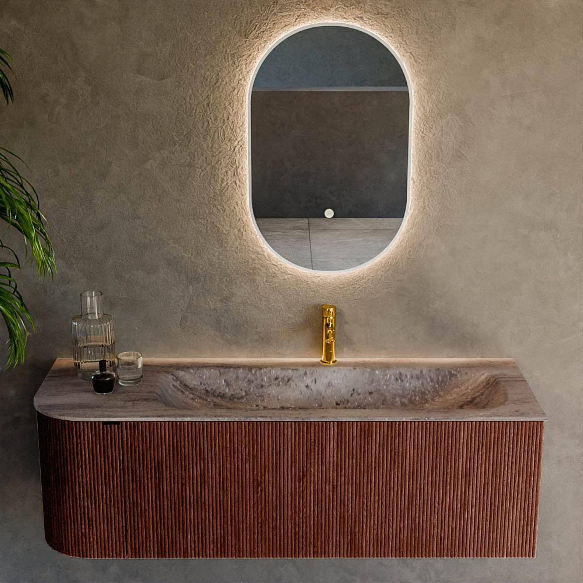 Le côté gauche arrondi confère au meuble une forme douce et organique qui attire immédiatement l'attention et offre en même temps une sensation agréable à l'usage quotidien : pas d'angles vifs le long desquels vous passez, mais une ligne fluide le long du mur. La couleur Ruby chaude avec façade à nervures crée profondeur et texture ; le meuble apparaît ainsi comme une véritable pièce de design plutôt que comme un simple meuble de rangement pratique. Comme le lavabo est placé à droite, vous gardez plus d'espace dégagé sur le côté gauche, idéal à proximité d'une douche, d'une porte ou d'un passage. La combinaison d'une largeur de 135 cm et d'un montage mural donne à l'ensemble un aspect flottant élégant, ce qui agrandit visuellement et illumine la salle de bains.