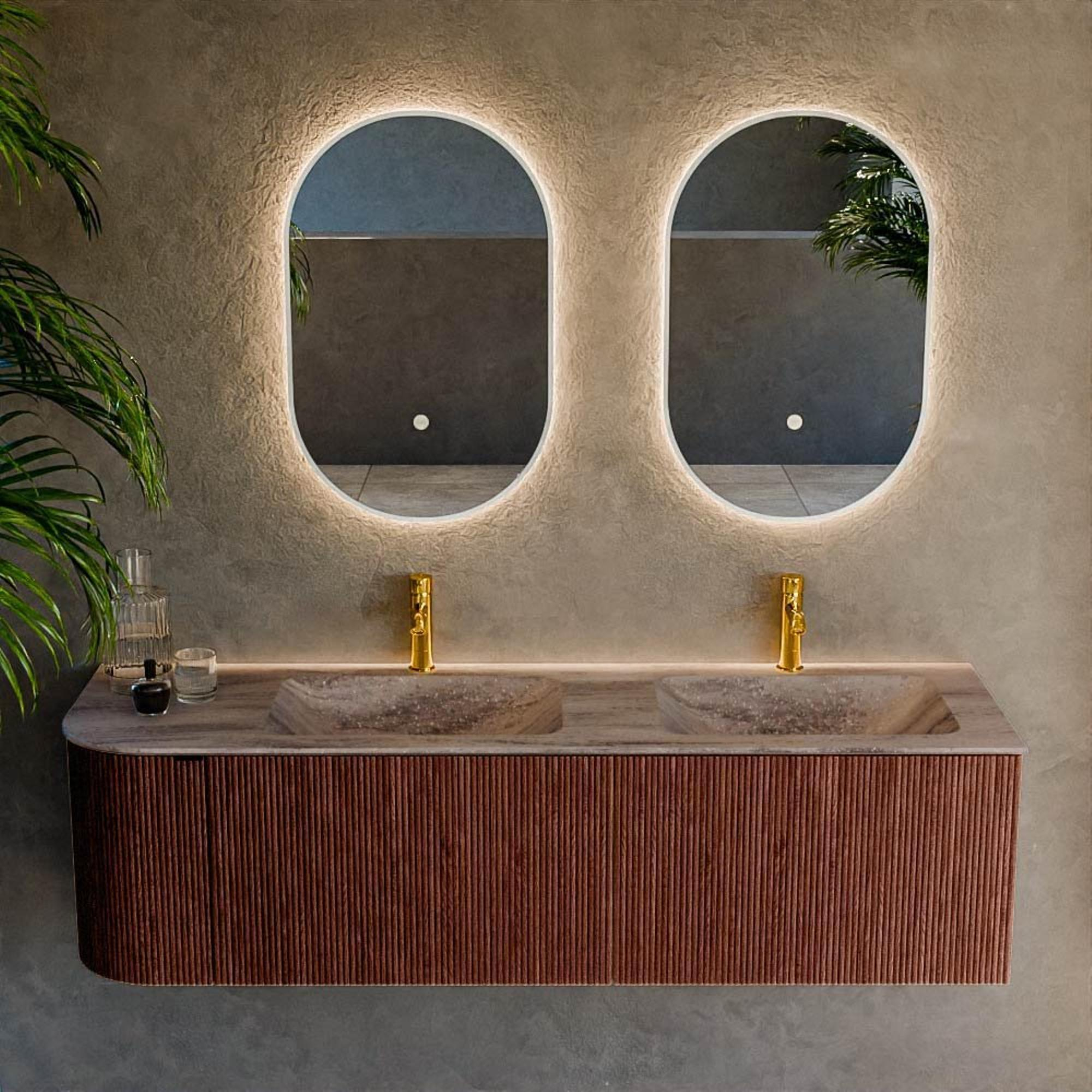 Avec ce meuble de salle de bains généreux, vous faites entrer chez vous un véritable accroche-regard qui non seulement est magnifique, mais rend également votre utilisation quotidienne de la salle de bains beaucoup plus confortable. La largeur généreuse de 155 cm combinée au double lavabo en fait un choix idéal pour les foyers occupés, les couples ou les familles qui se retrouvent souvent en même temps dans la salle de bains le matin. Le côté gauche arrondi donne une apparence douce et organique et offre en même temps un espace de circulation supplémentaire, ce qui rend ce meuble très adapté aussi bien aux grandes salles de bains qu’aux salles de bains familiales intelligemment agencées où chaque centimètre compte. La couleur Ruby profonde et la façade rainurée créent une ambiance luxueuse digne d’un hôtel, tandis que l’agencement pratique avec tiroirs et porte vous aide à ranger tous vos accessoires de salle de bains de manière ordonnée et hors de vue. Si vous recherchez un meuble moderne, sans poignées, avec beaucoup d’espace de rangement, un double lavabo et une couleur de design marquée, alors ce meuble correspond parfaitement à vos souhaits.