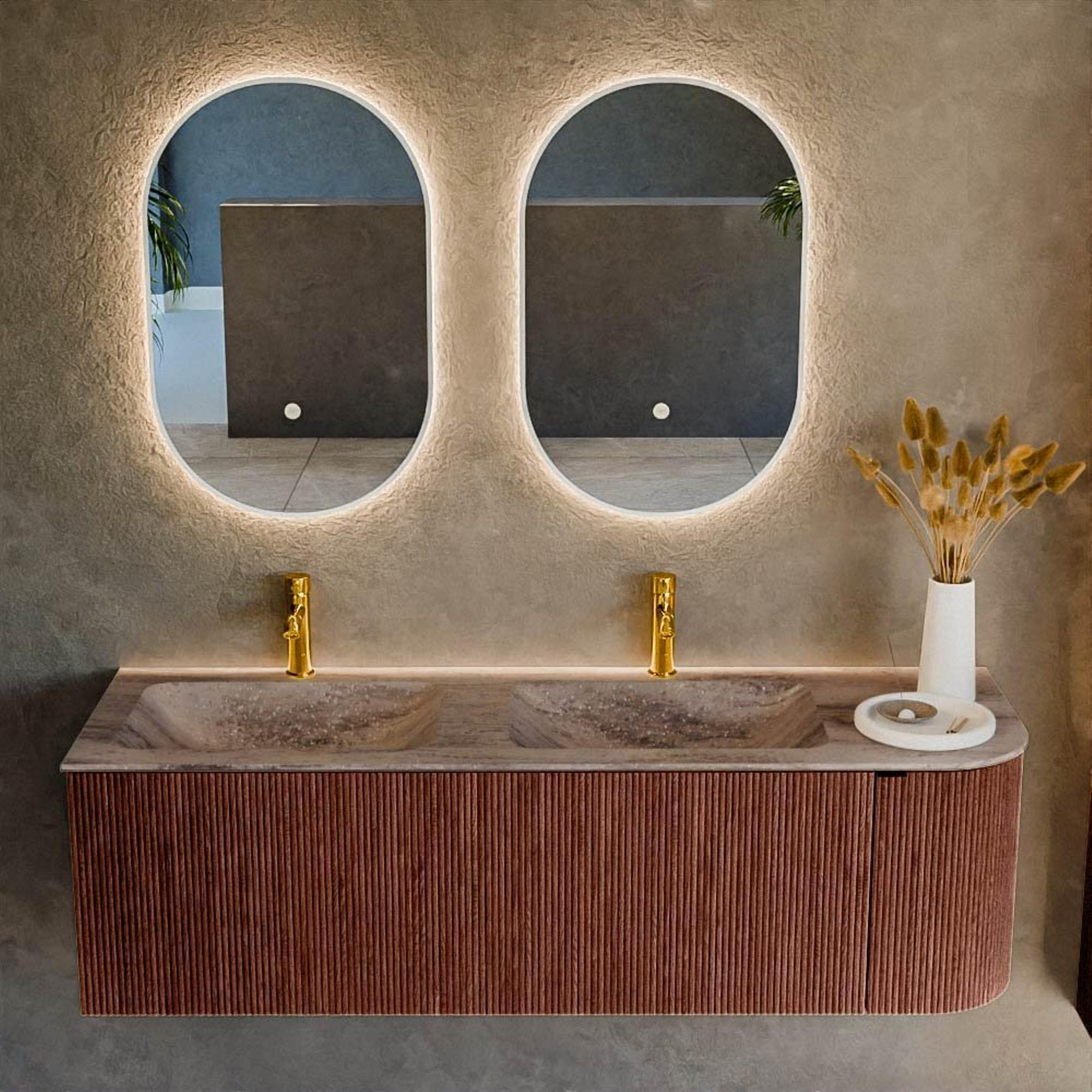 Avec ce meuble de salle de bains spacieux, vous faites entrer un véritable accroche-regard chez vous qui combine sans effort fonctionnalité et design. La forme arrondie sur le côté droit apporte une ligne douce et organique dans votre salle de bains, tandis que la chaleureuse couleur Ruby ajoute immédiatement de l’ambiance et du luxe. Grâce à sa grande largeur, ce meuble est idéal pour les salles de bains de taille moyenne à grande, que vous ayez une vie de famille bien remplie ou que vous souhaitiez simplement disposer de tout l’espace nécessaire pour votre rituel quotidien. La double vasque offre un confort lorsque vous commencez la journée à deux, tandis que l’agencement pratique avec tiroir et porte permet de garder vos produits de soin bien à l’abri des regards. Grâce au montage mural, l’ensemble paraît en outre particulièrement aéré et épuré, ce qui rend ce meuble parfait pour les salles de bains modernes et axées sur le design.
