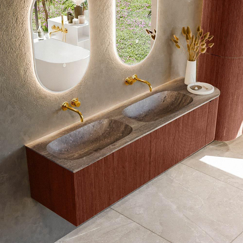 Avec ce meuble de salle de bains généreux, vous créez en une seule fois une base à la fois élégante et pratique pour votre salle de bains. Grâce à sa largeur généreuse, il est idéal pour les grandes salles de bains ou pour une salle de bains familiale luxueuse où plusieurs personnes utilisent le plan vasque en même temps. L'arrondi ludique sur le côté droit apporte une ligne plus douce dans l'espace et rend le passage à l'entrée ou le long de la baignoire ou de la douche plus confortable. La teinte Ruby profonde et chaleureuse ajoute du caractère aux salles de bains modernes, d'hôtel chic ou design, tandis que les lignes épurées et les façades sans poignées apportent justement calme et aspect ordonné. La double vasque est parfaite si vous ne voulez pas perdre de temps à attendre le matin et, comme le plan ne comporte pas de trous de robinetterie, vous avez toute liberté pour choisir vous-même les plus beaux mitigeurs à poser – ou au contraire opter pour une solution encastrée minimaliste.