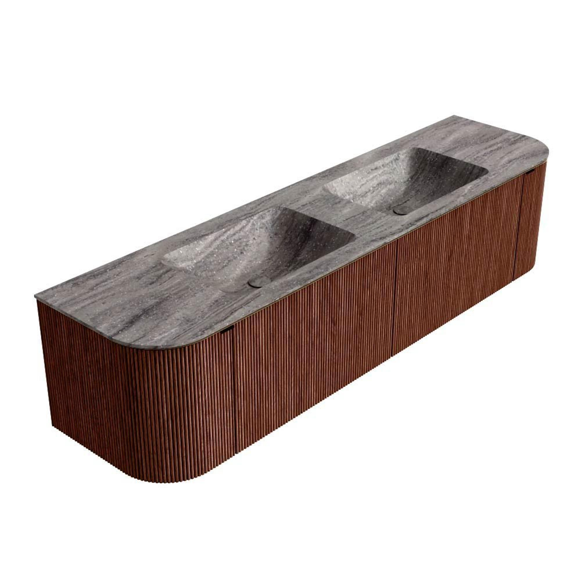 MONDIAZ KURVE-DLUX Meuble de salle de bains 180cm arrondi gauche + droite couleur Ruby avec 2 tiroirs et 2 portes. Plan-vasque LEAF Double 2 trous de robinet Oza.