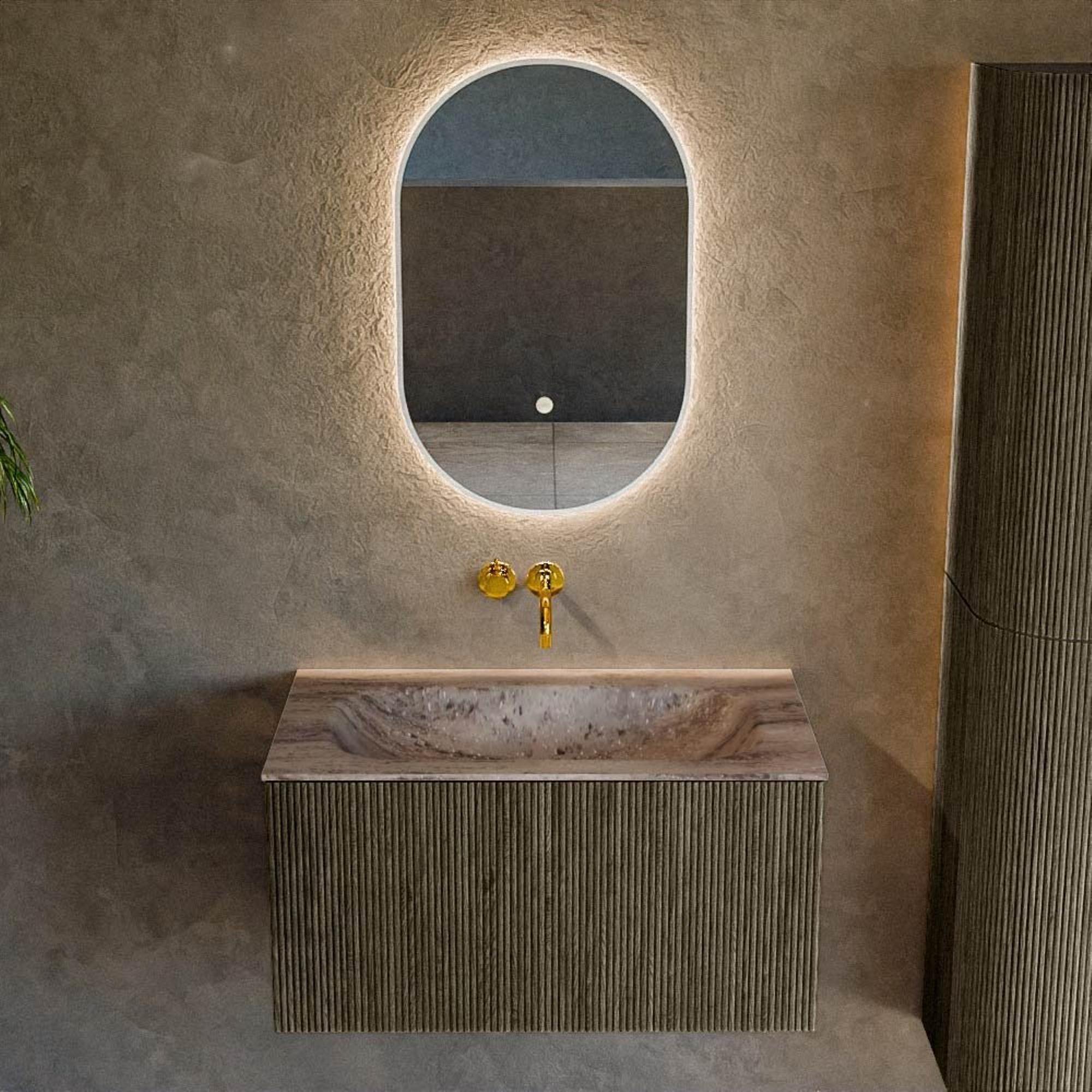 La couleur Shadow combinée à la façade nervurée verticale donne à ce meuble une allure design chaleureuse sans être tape-à-l’œil. La teinte gris foncé douce se marie très bien avec des carreaux aspect béton, de la pierre naturelle claire ou au contraire des murs blancs, donnant immédiatement à votre salle de bains une atmosphère d’hôtel de luxe. La façade 3D avec structure verticale crée un jeu de lumière ludique et rend le meuble un peu différent d’une façade standard plane. Comme la cuve est joliment positionnée au centre, l’ensemble devient symétrique et apporte de la sérénité à l’espace. Même dans les petites salles de bains, ce meuble suspendu paraît léger, tout en offrant une solution de vasque complète.